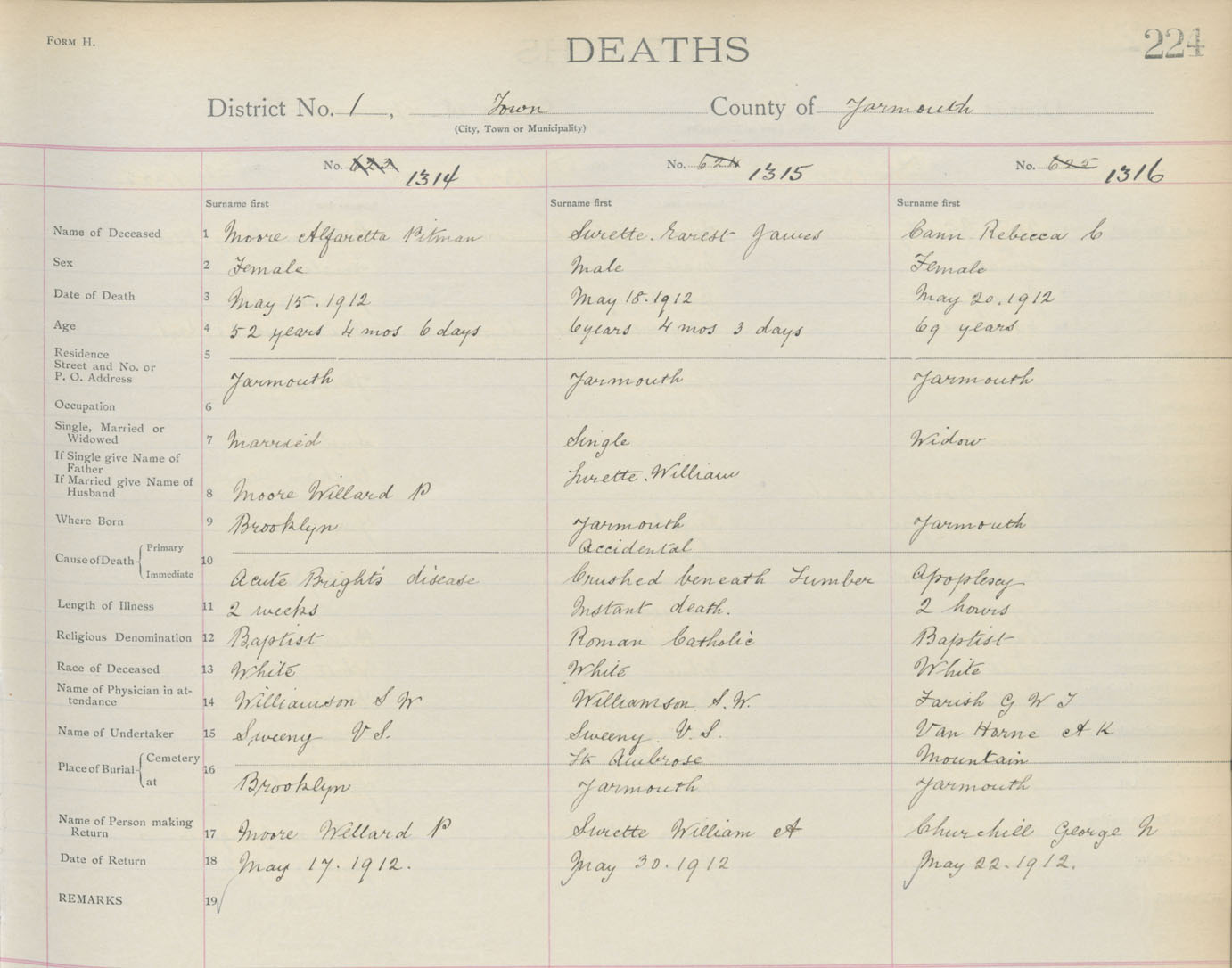Death Registration: Year: 1912 book: 19 page: 224 number: 1314
