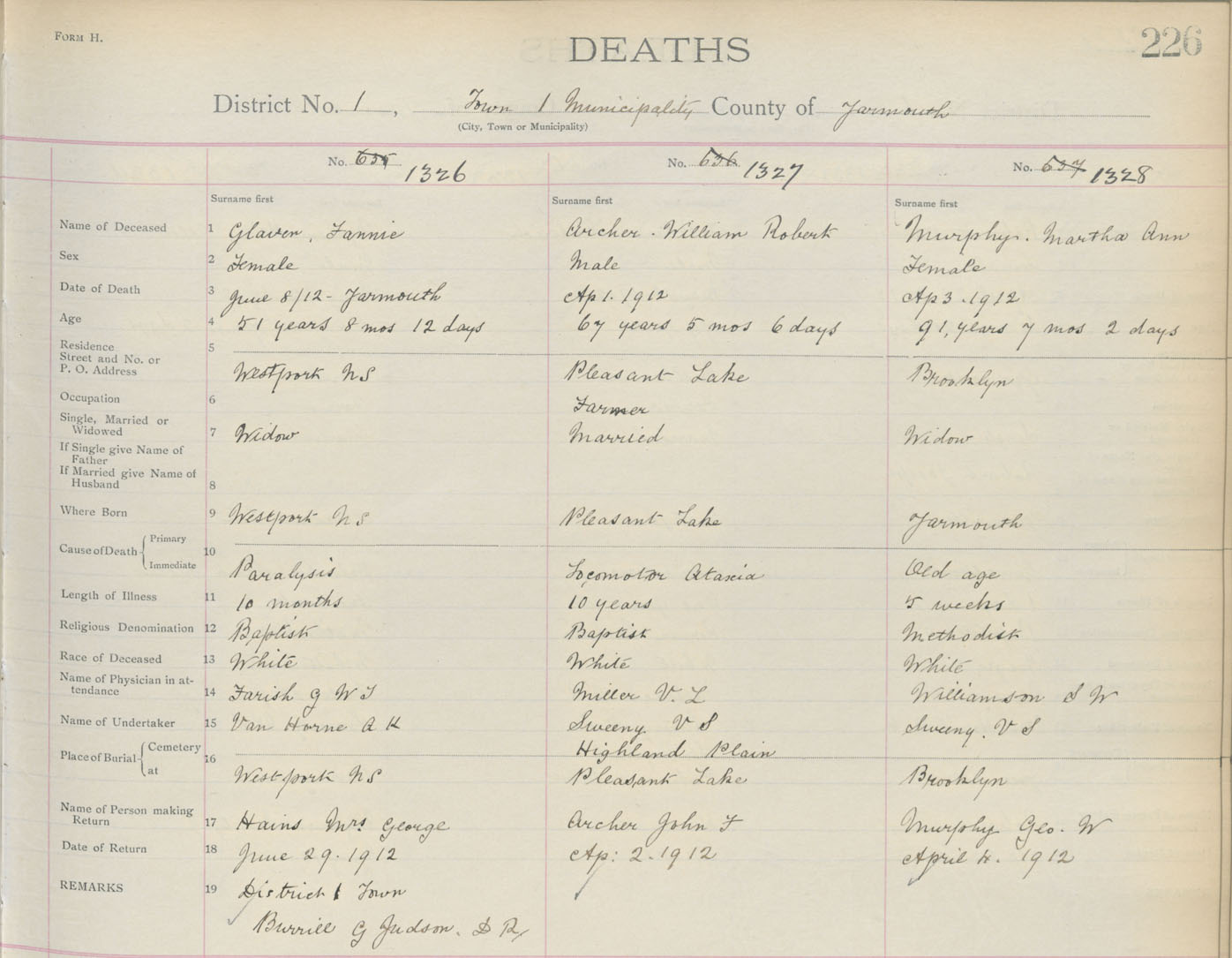 Death Registration: Year: 1912 book: 19 page: 226 number: 1327
