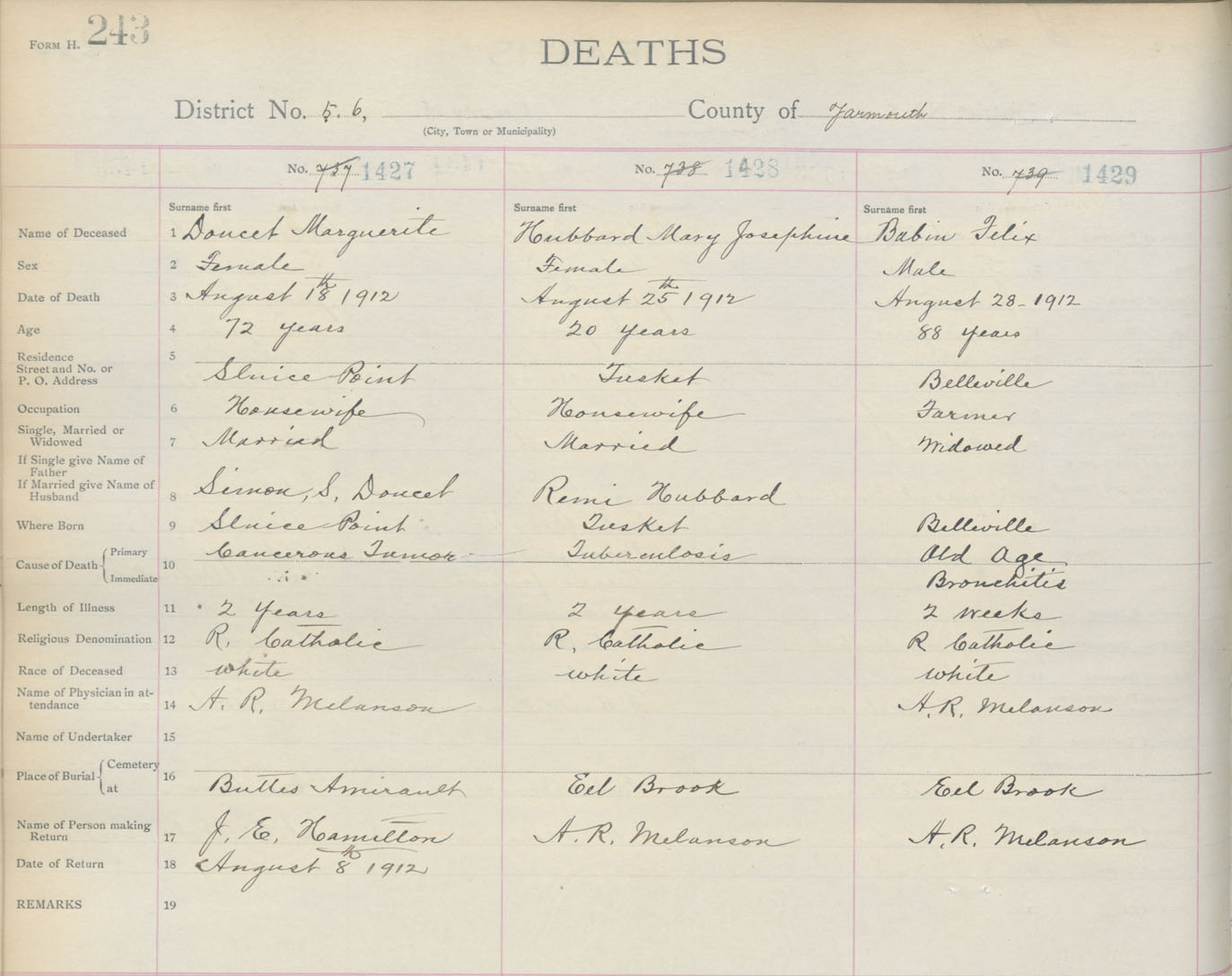 Death Registration: Year: 1912 book: 19 page: 243 number: 1427