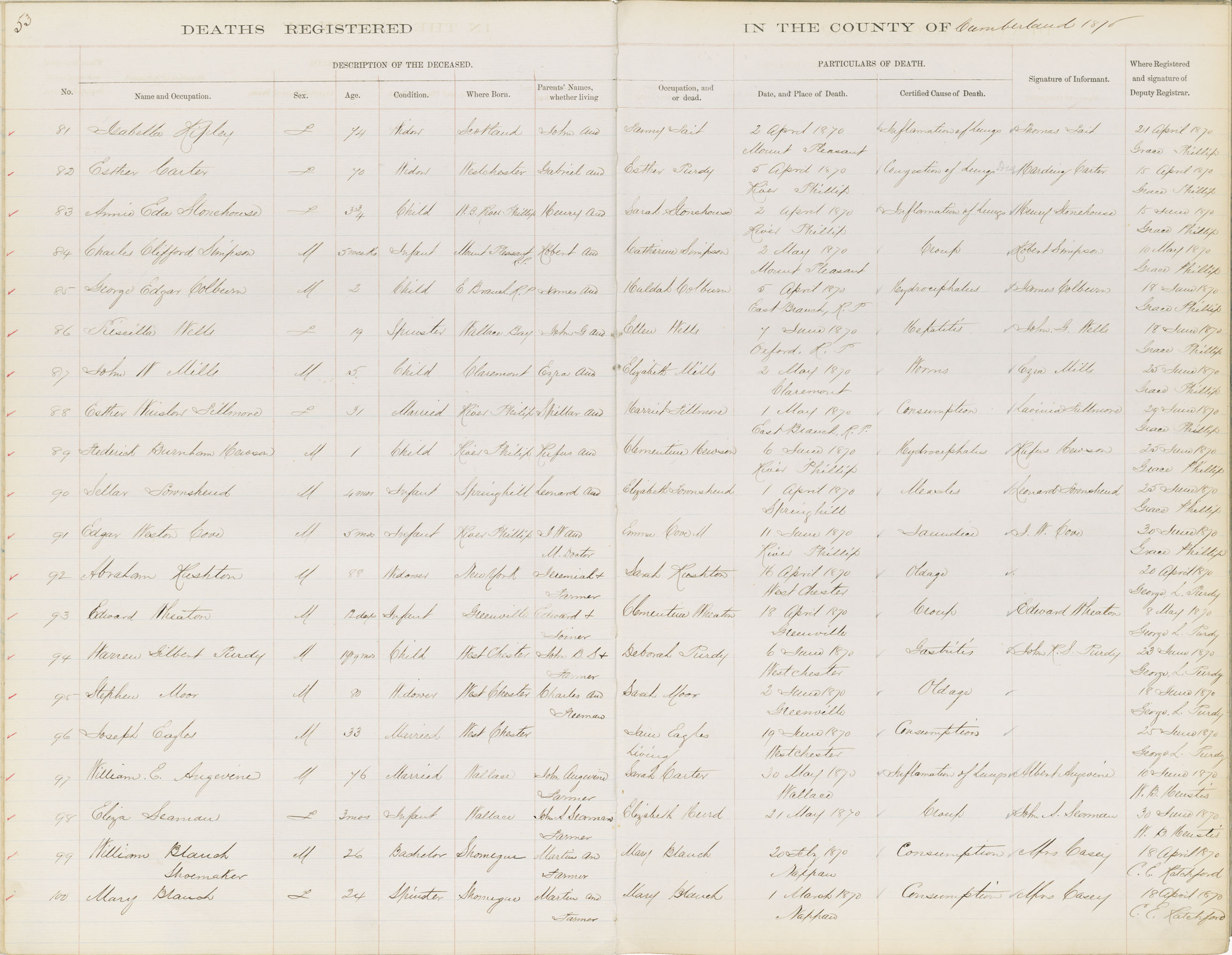 Death Registration: Year: 1870 book: 1805 page: 53 number: 84