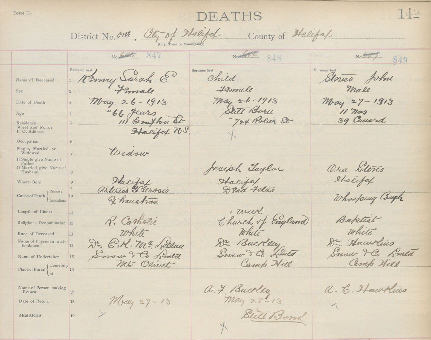 Female Death Registration: Year: 1913 book: 20 page: 142 number: 849