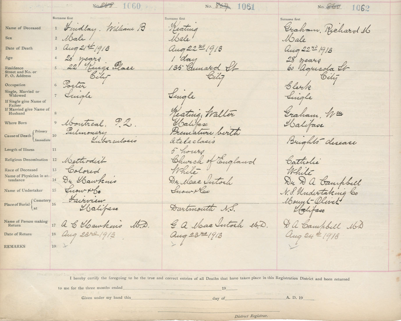 Male Death Registration: Year: 1913 book: 20 page: 177 number: 1062