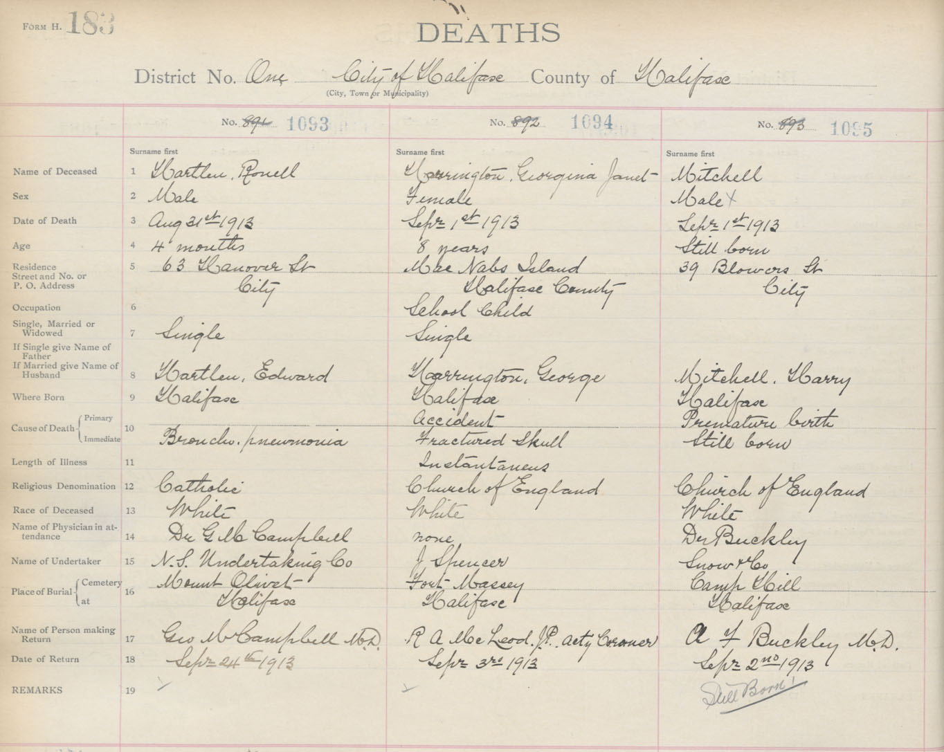 Male Death Registration: Year: 1913 book: 20 page: 183 number: 1095