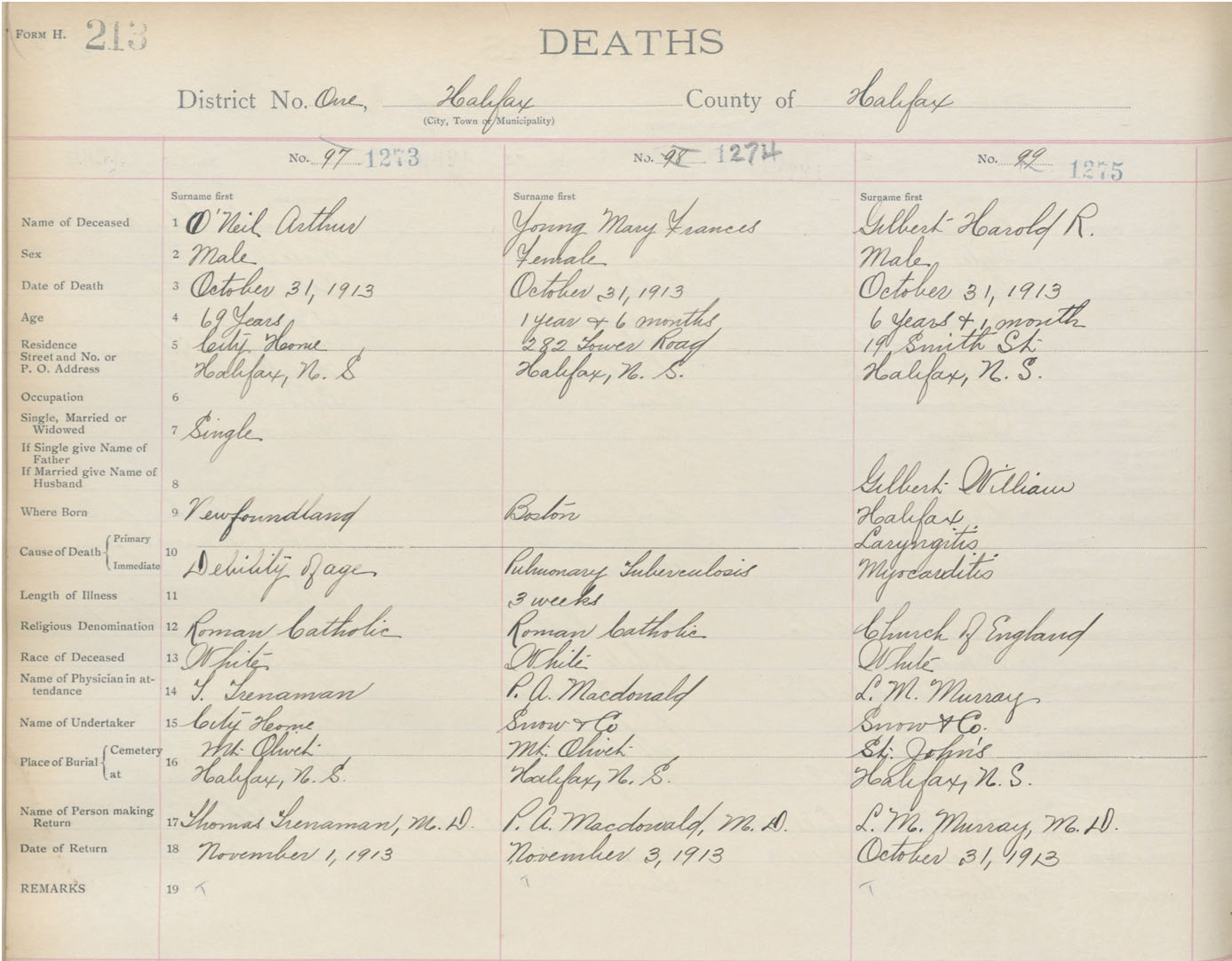 Death Registration: Year: 1913 book: 20 page: 213 number: 1275
