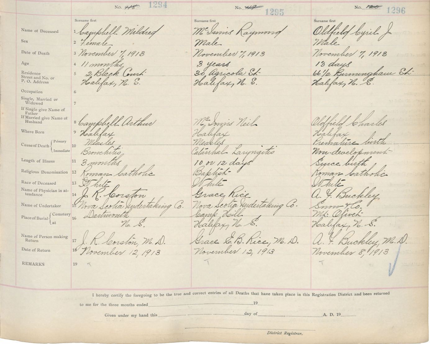 Death Registration: Year: 1913 book: 20 page: 216 number: 1296