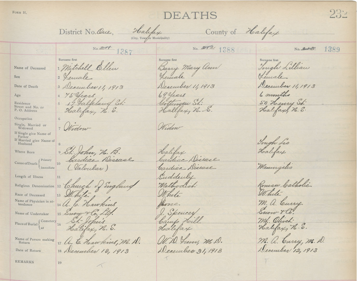Death Registration: Year: 1913 book: 20 page: 232 number: 1389