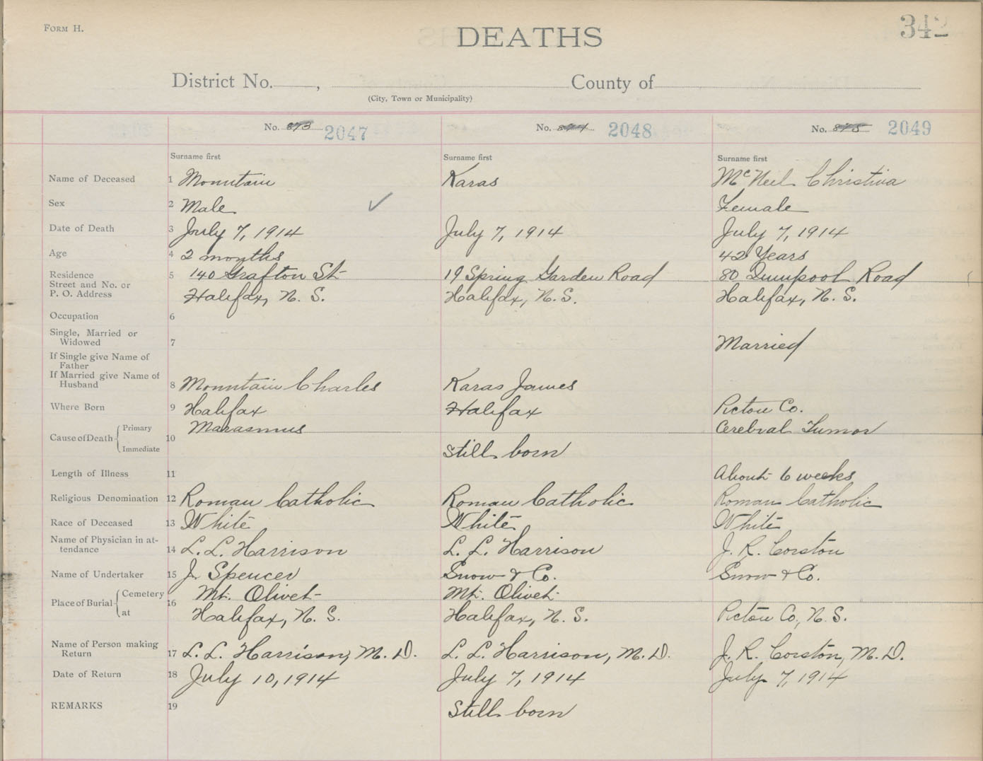 Male Death Registration: Year: 1914 book: 20 page: 342 number: 2049