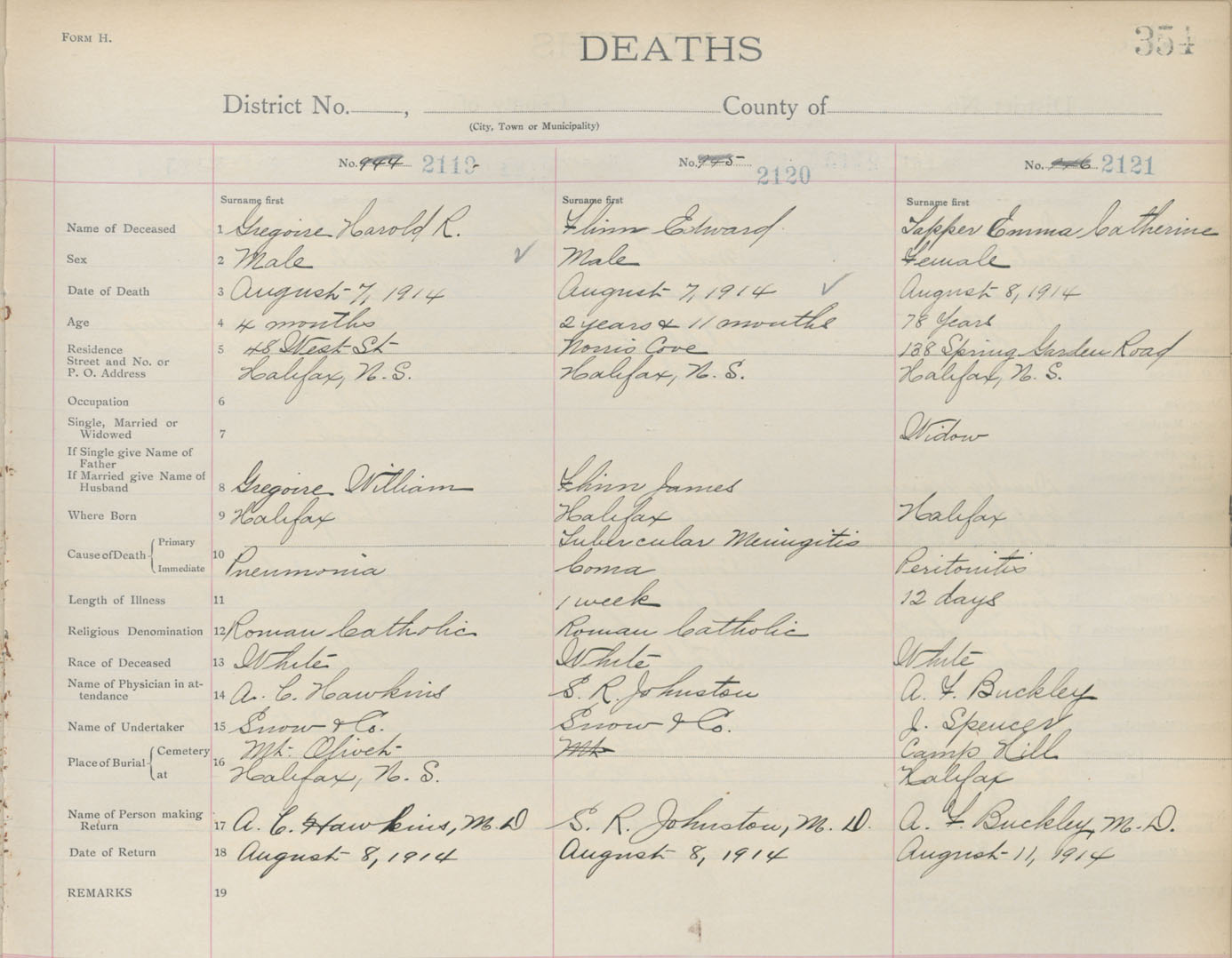 Death Registration: Year: 1914 book: 20 page: 354 number: 2121