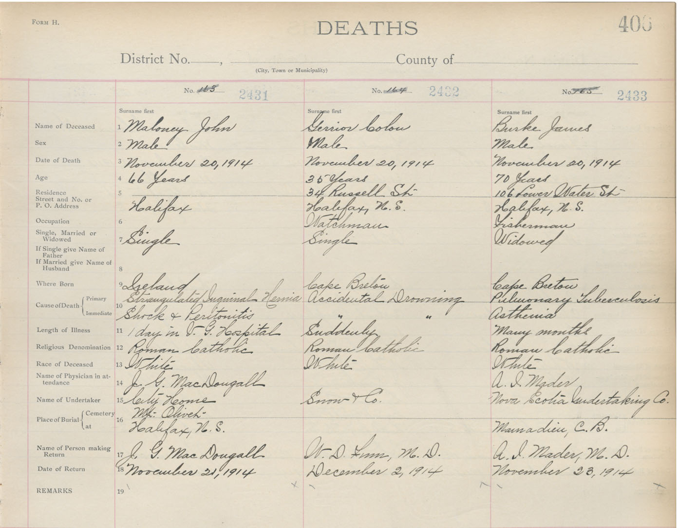 Death Registration: Year: 1914 book: 20 page: 406 number: 2431