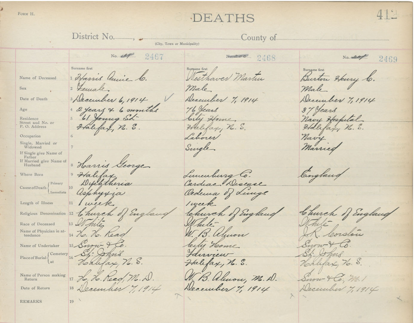 Death Registration: Year: 1914 book: 20 page: 412 number: 2467