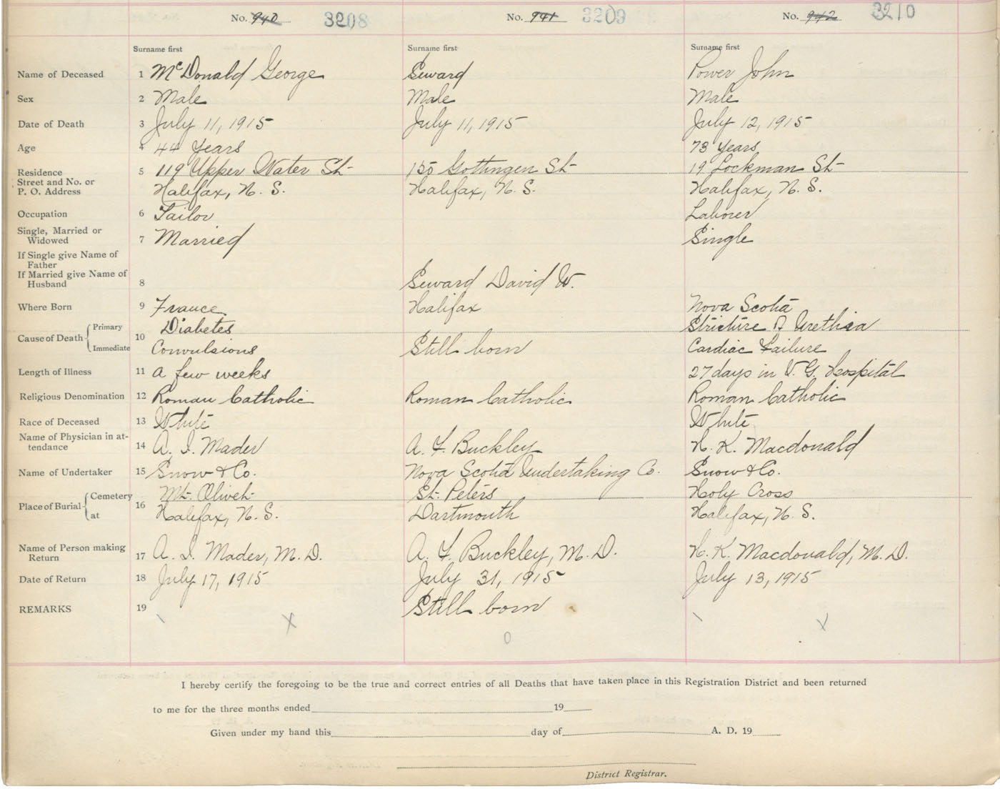Male Death Registration: Year: 1915 book: 20 page: 535 number: 3210
