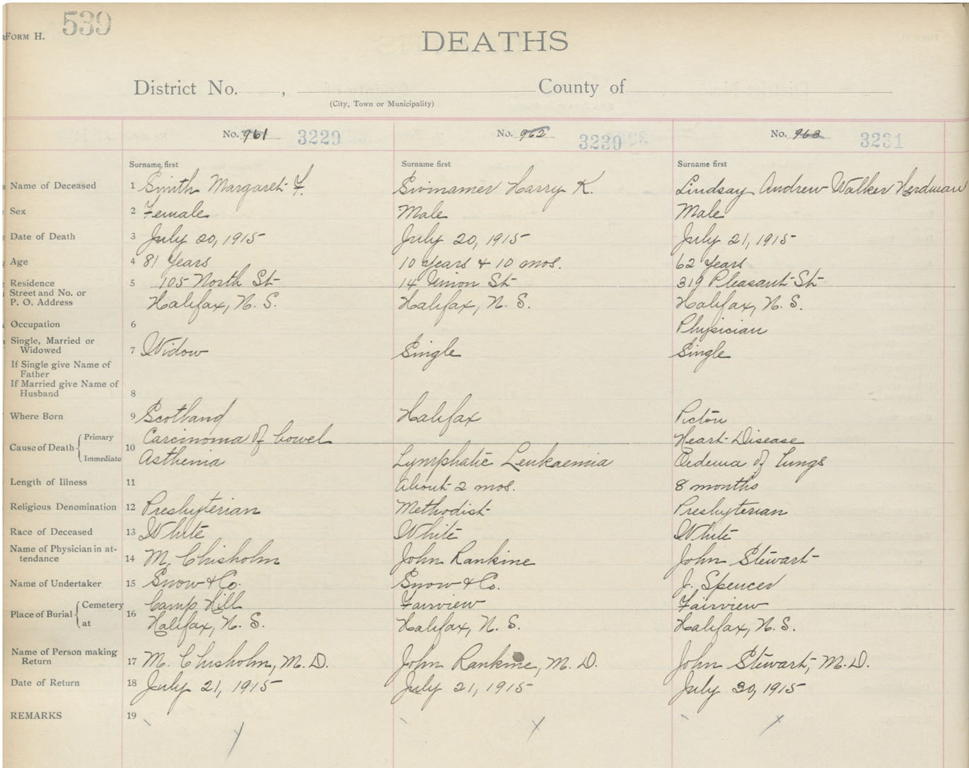 Male Death Registration: Year: 1915 book: 20 page: 539 number: 3231