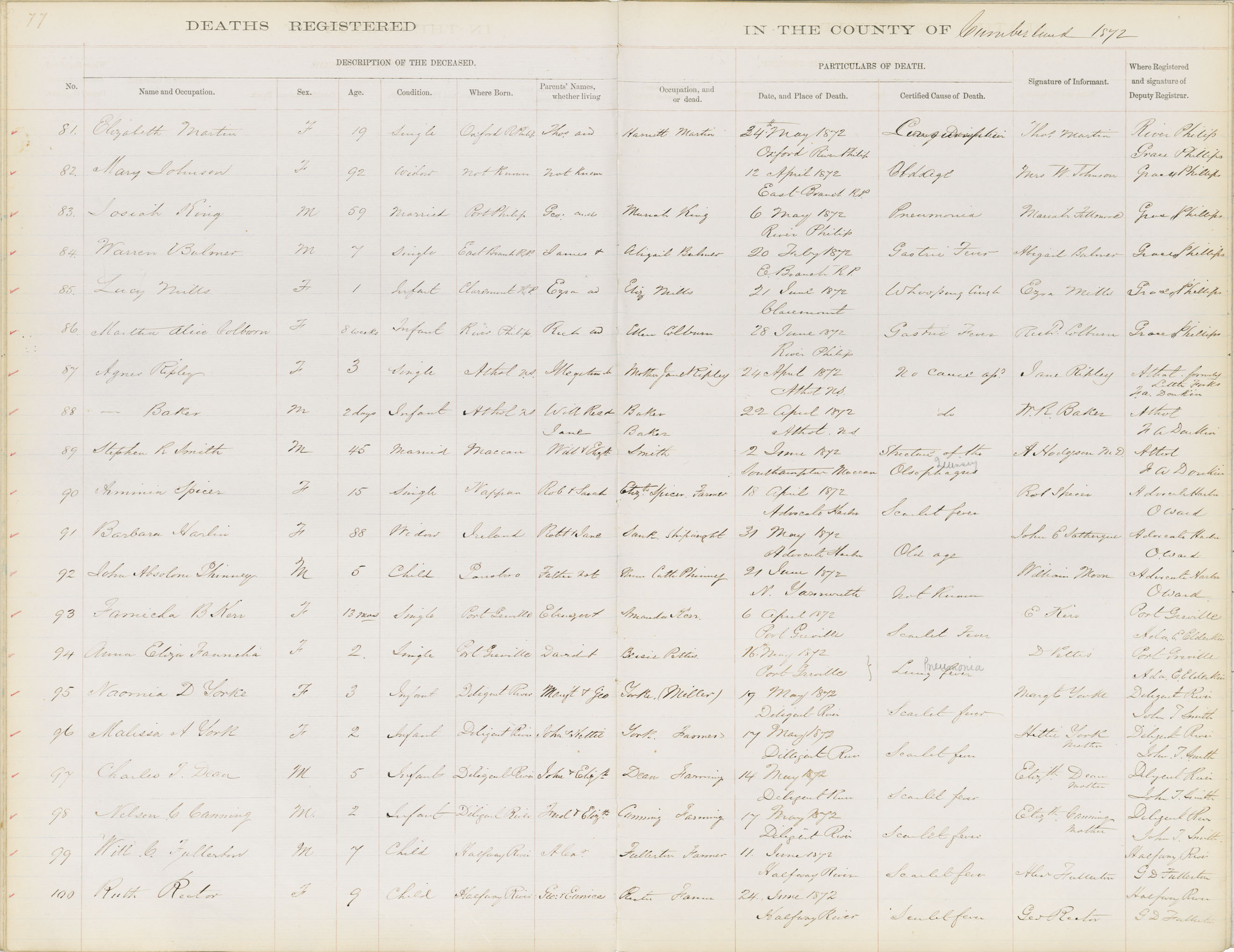 Death Registration: Year: 1872 book: 1805 page: 77 number: 100