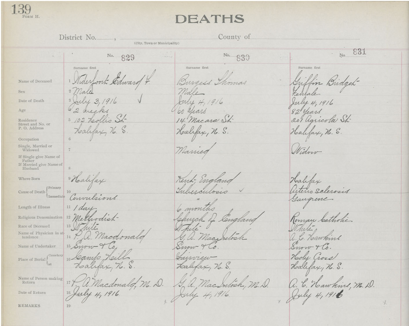 Death Registration: Year: 1916 book: 21 page: 139 number: 831