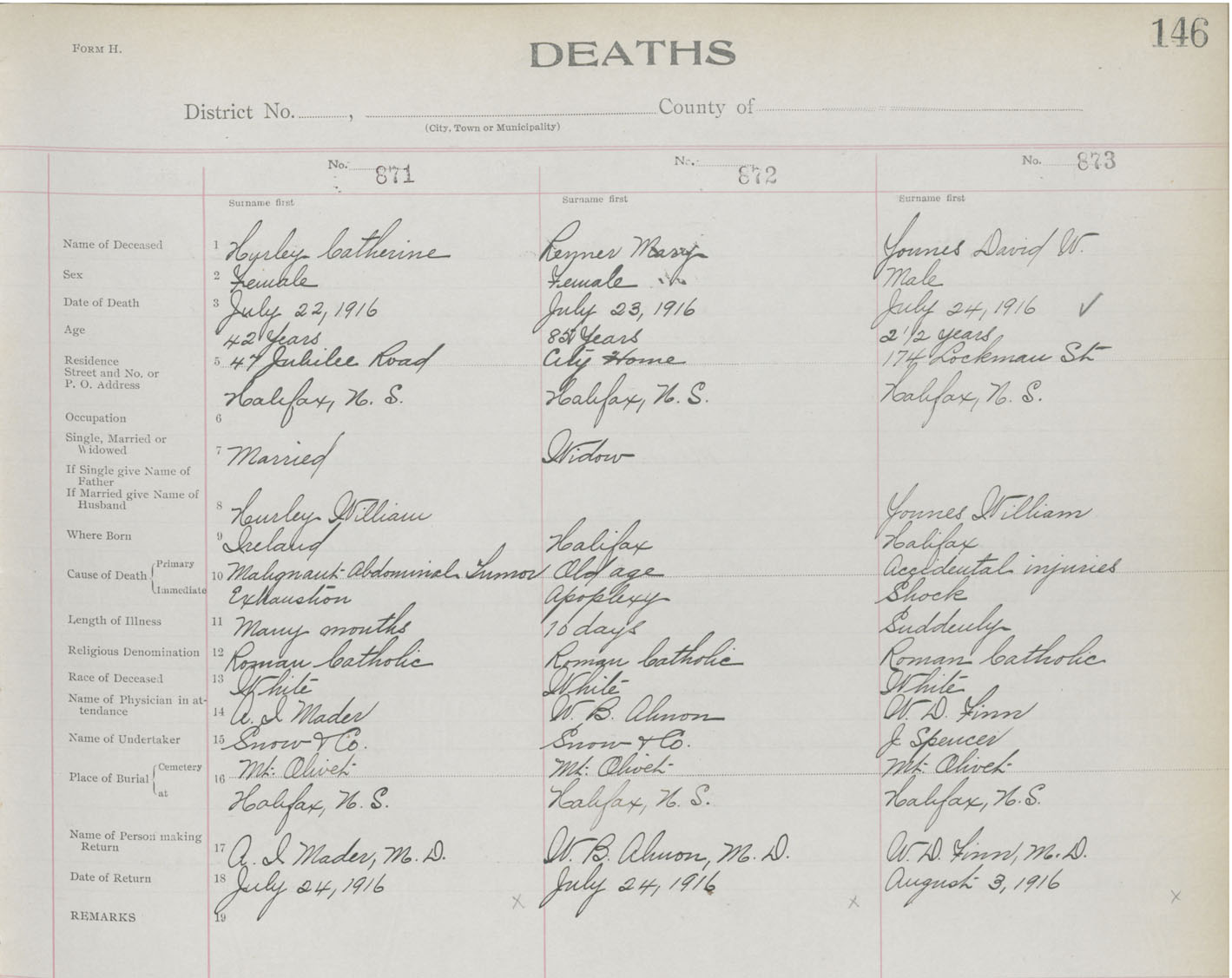 Death Registration: Year: 1916 book: 21 page: 146 number: 873