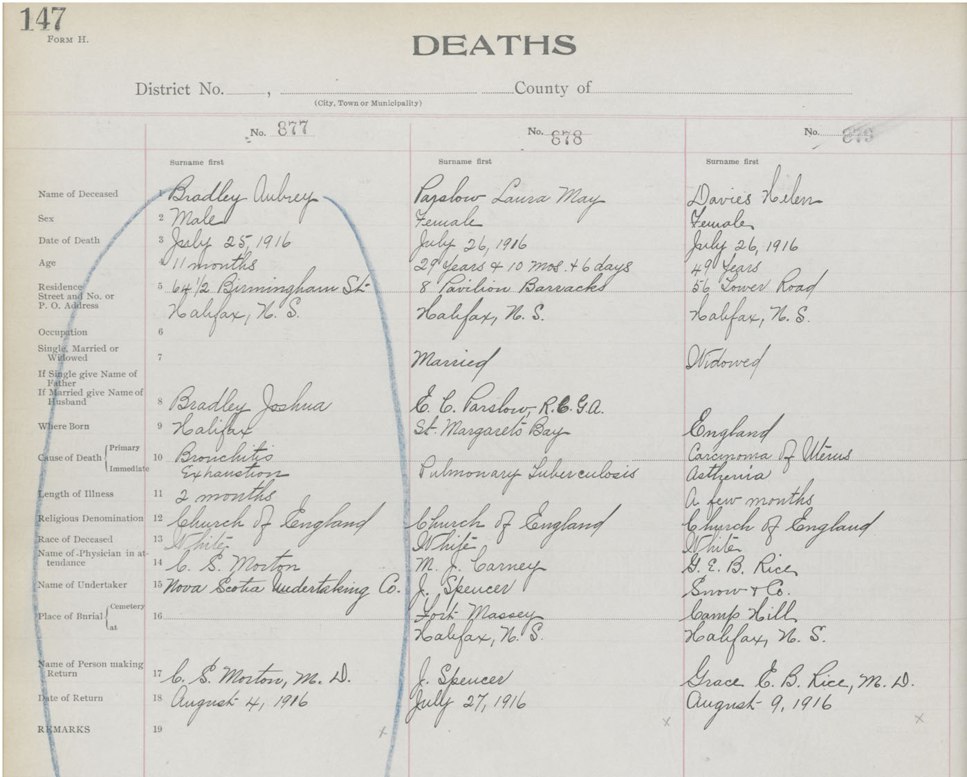 Death Registration: Year: 1916 book: 21 page: 147 number: 879