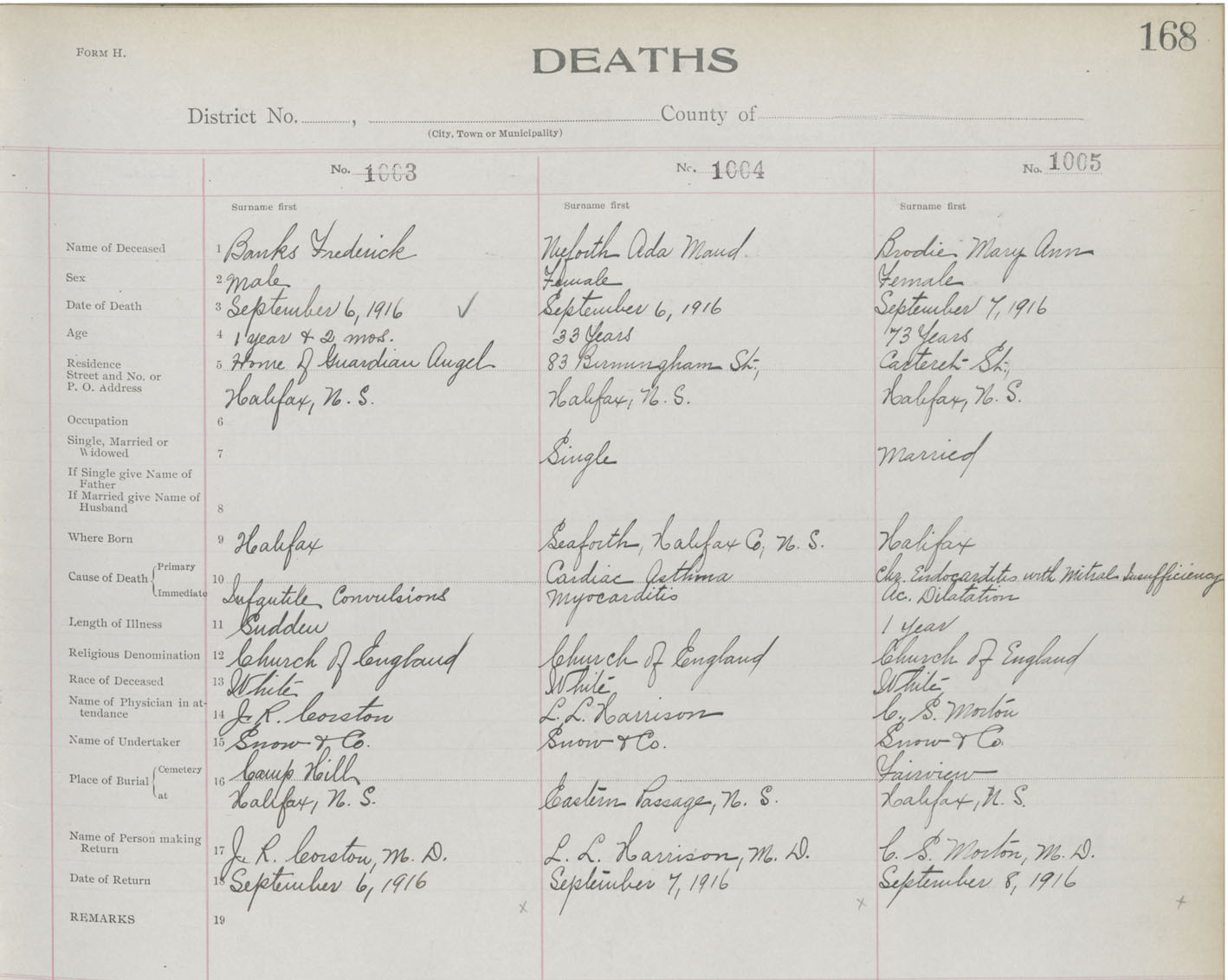 Death Registration: Year: 1916 book: 21 page: 168 number: 1005