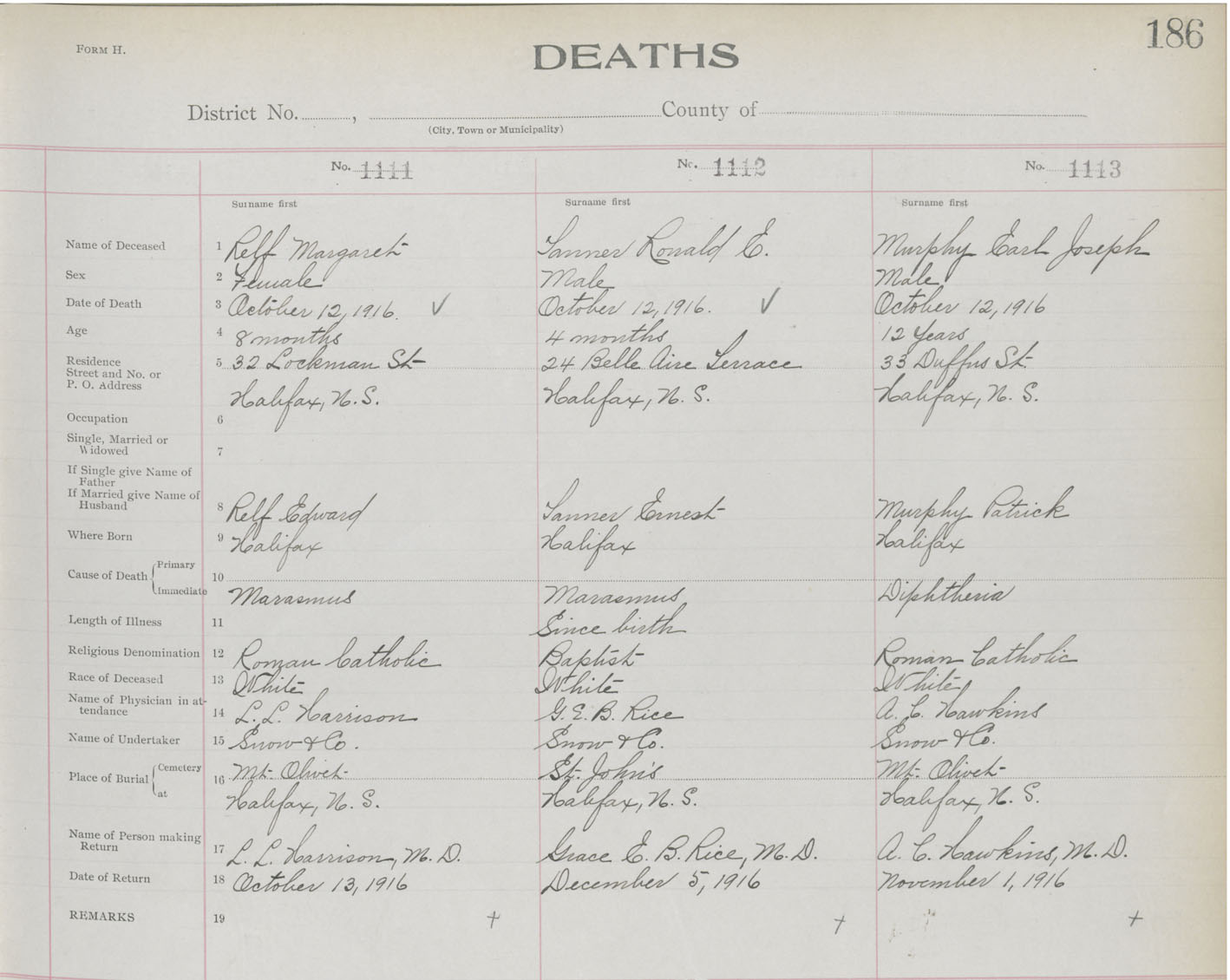 Death Registration: Year: 1916 book: 21 page: 186 number: 1113