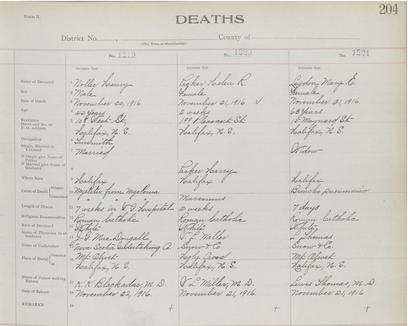 Death Registration: Year: 1916 book: 21 page: 204 number: 1219
