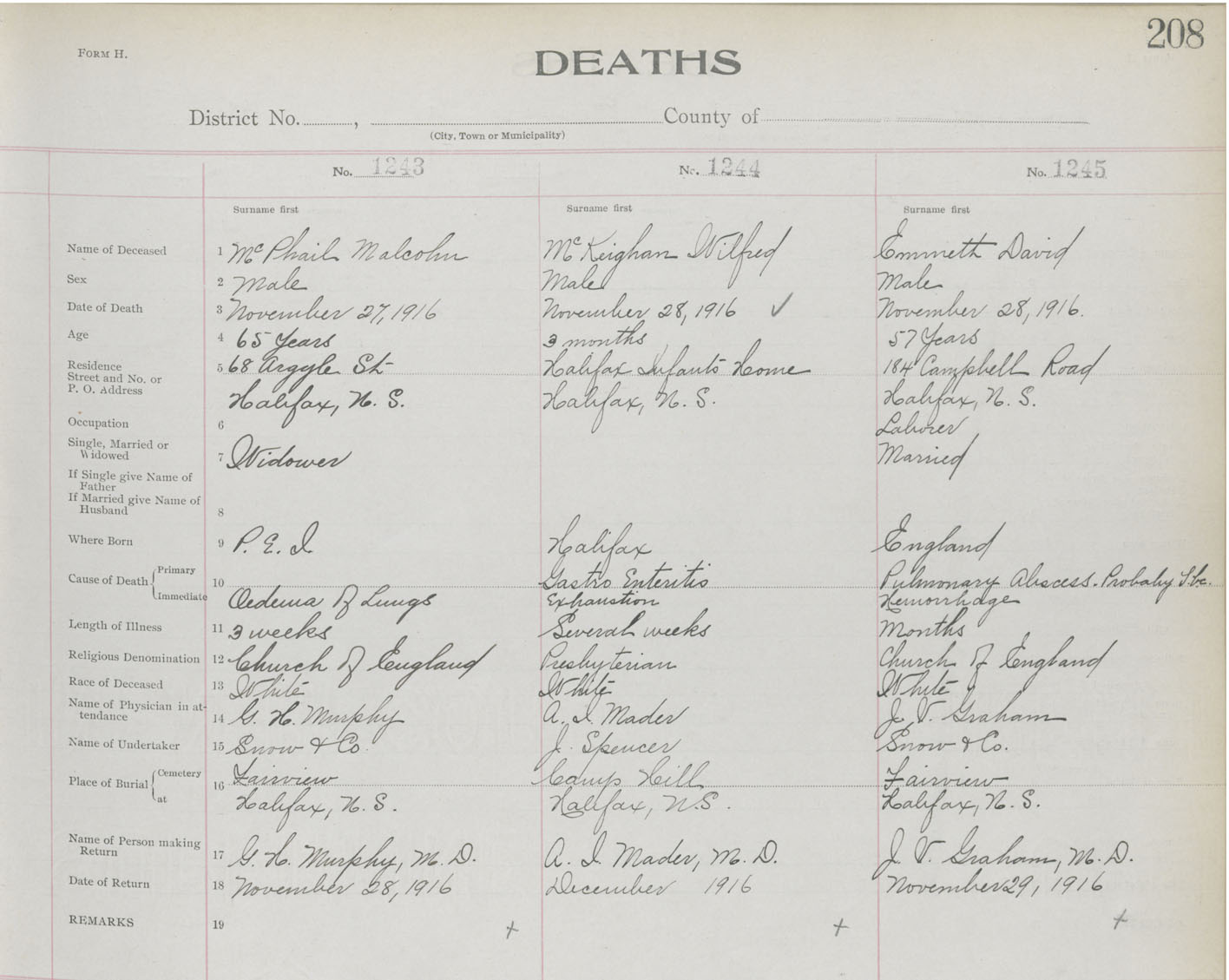 Death Registration: Year: 1916 book: 21 page: 208 number: 1243