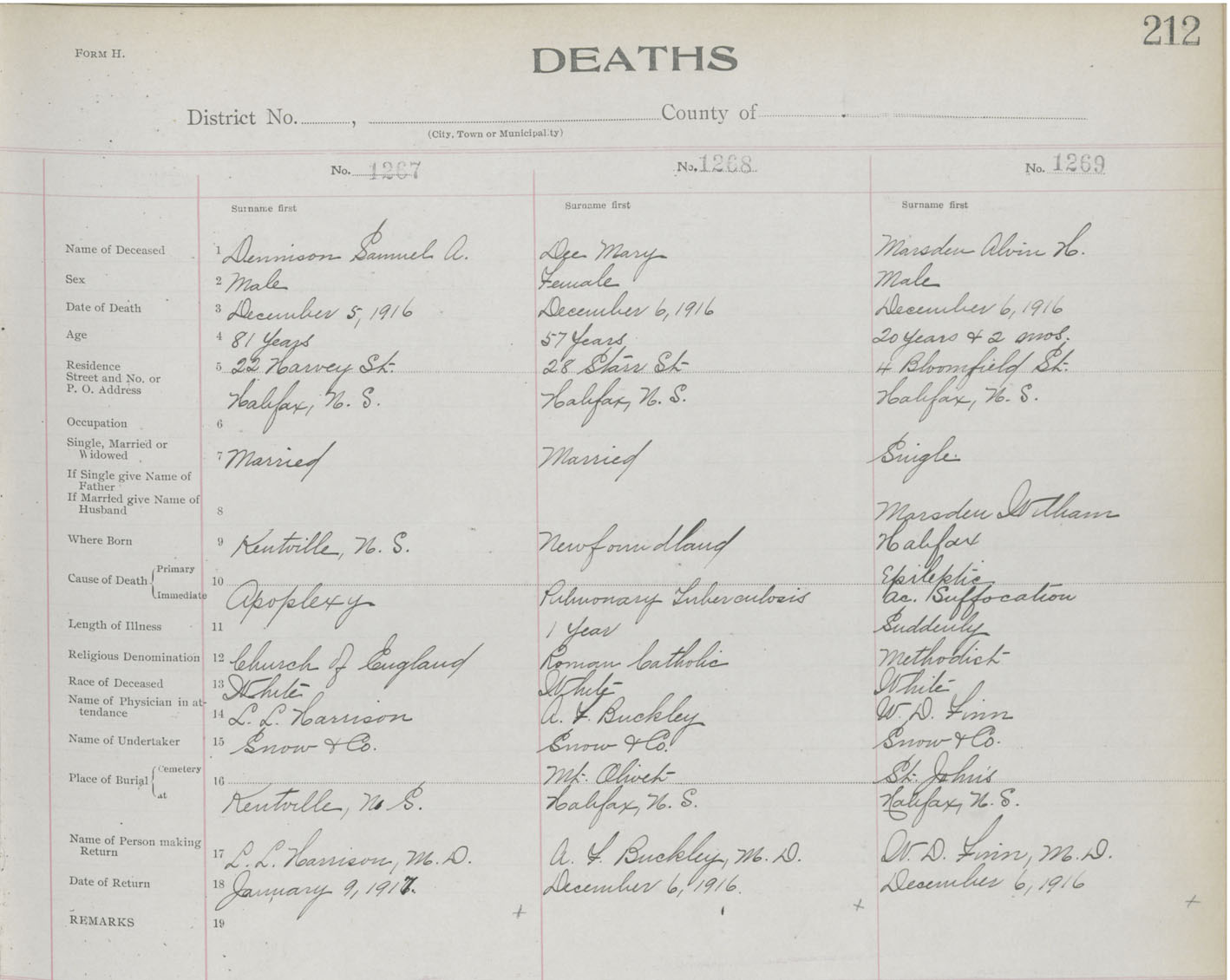 Death Registration: Year: 1916 book: 21 page: 212 number: 1267