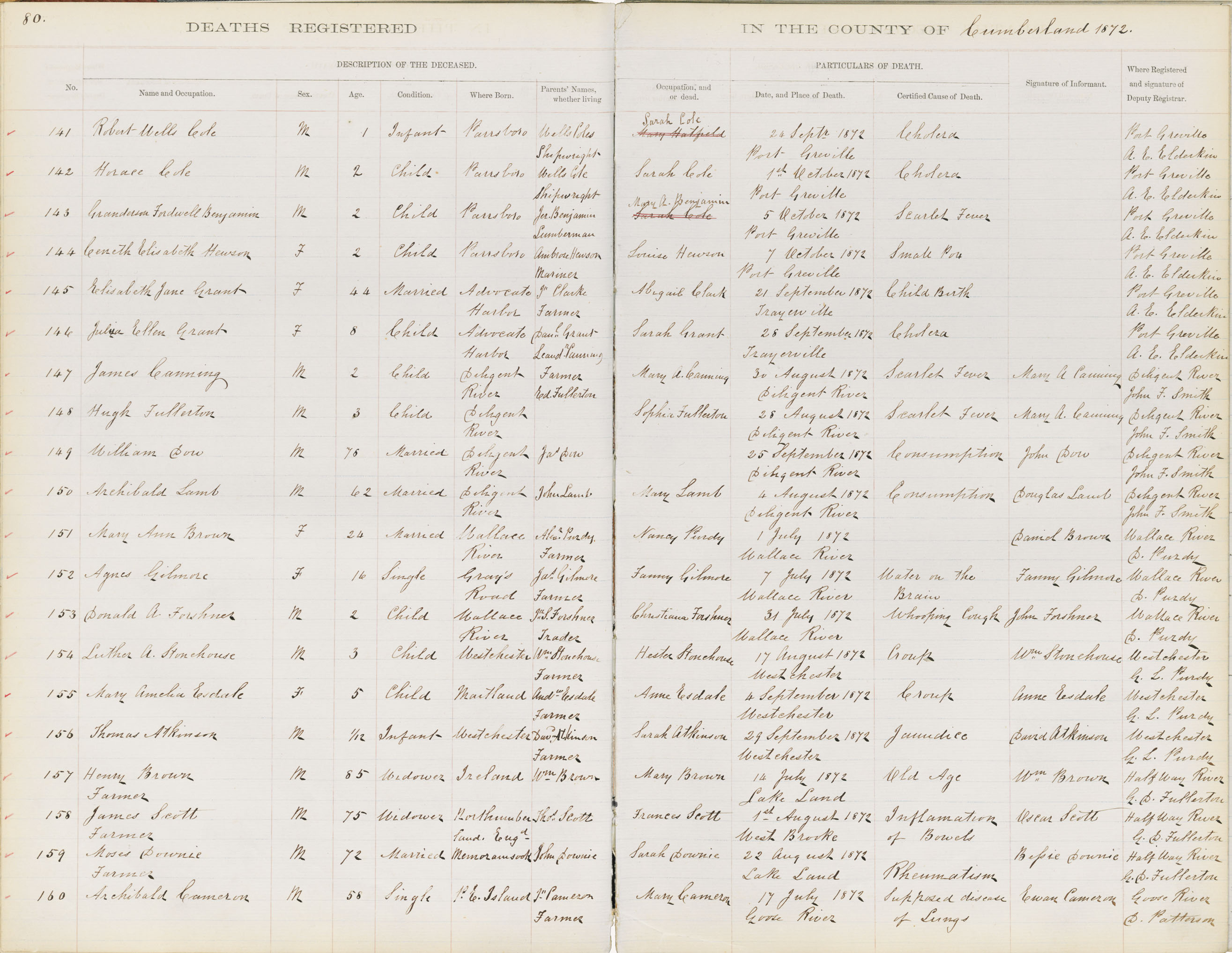 Death Registration: Year: 1872 book: 1805 page: 80 number: 160