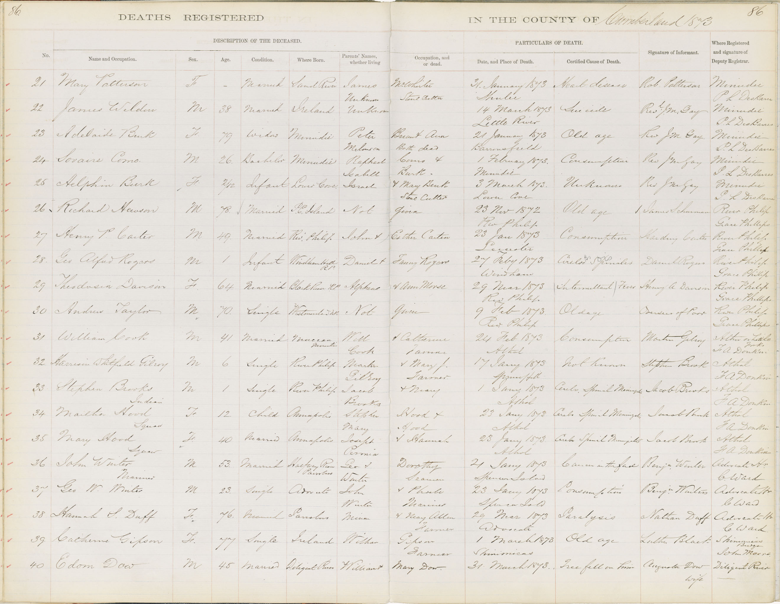 Death Registration: Year: 1873 book: 1805 page: 86 number: 40