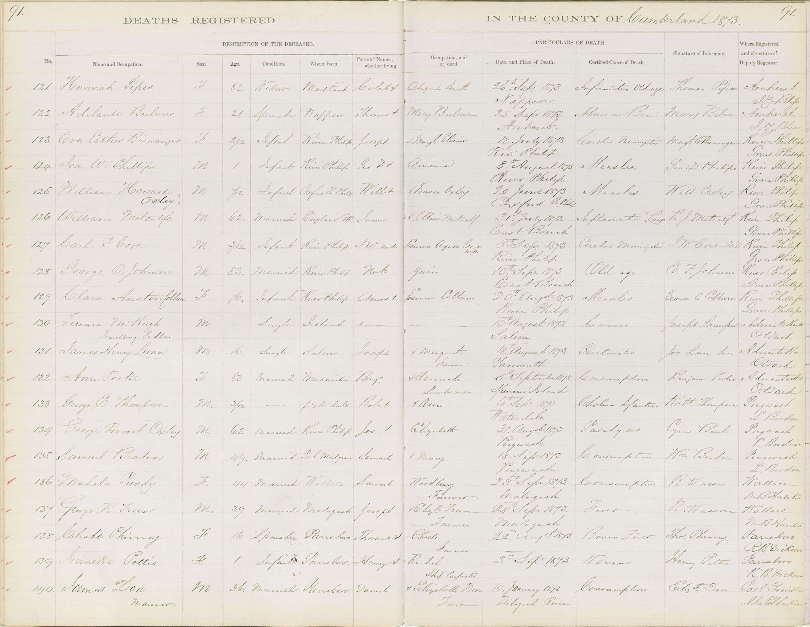 Male Death Registration: Year: 1873 book: 1805 page: 91 number: 125