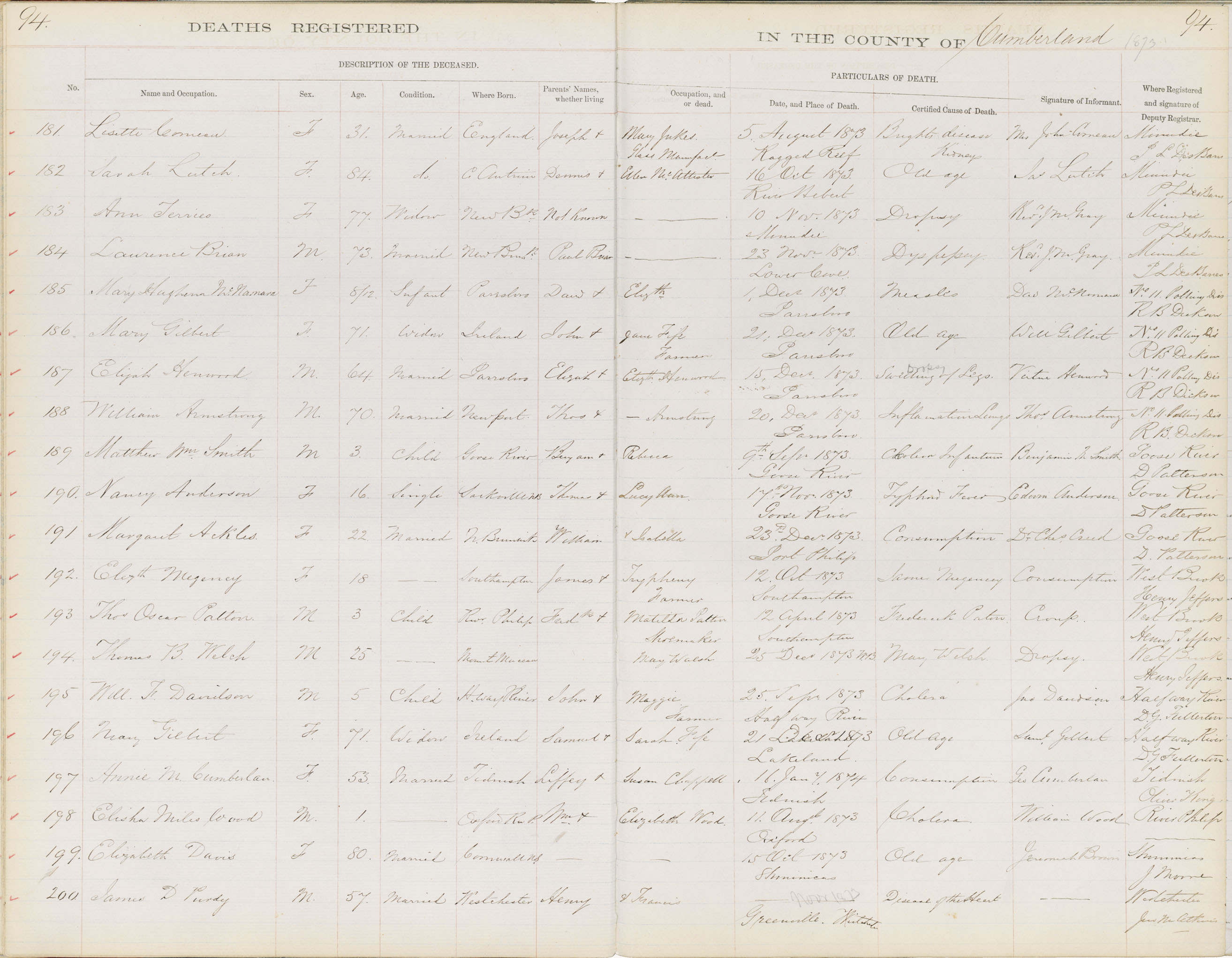 Death Registration: Year: 1873 book: 1805 page: 94 number: 181