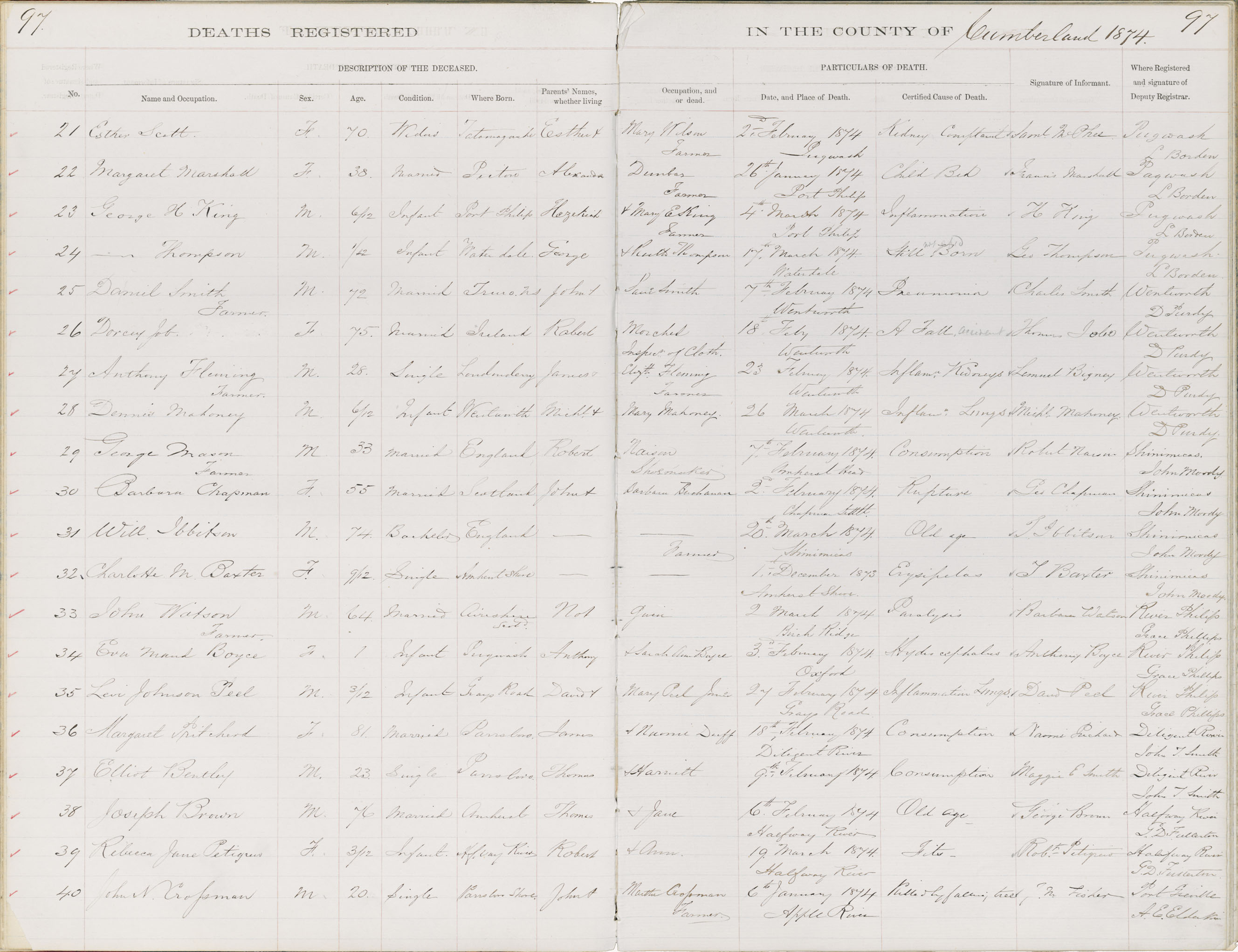 Death Registration: Year: 1874 book: 1805 page: 97 number: 21