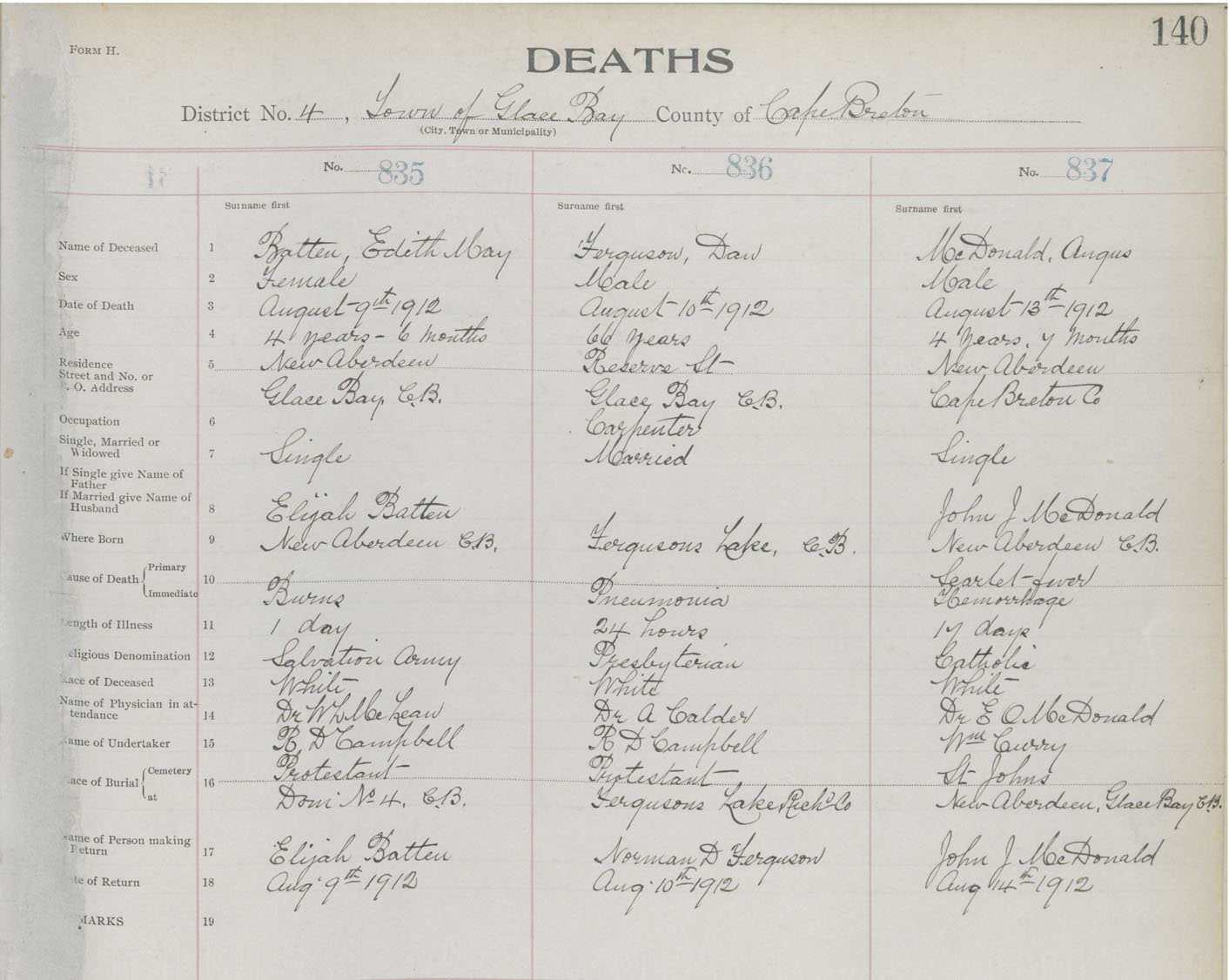 Death Registration: Year: 1912 book: 22 page: 140 number: 836