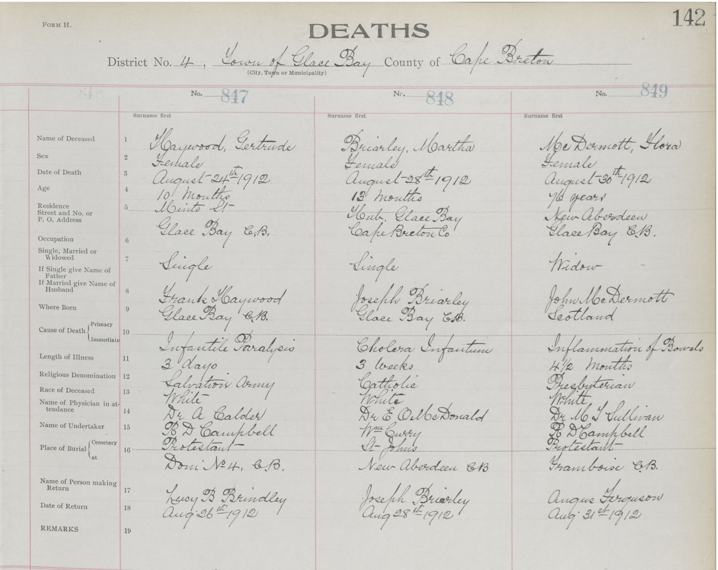 Death Registration: Year: 1912 book: 22 page: 142 number: 847