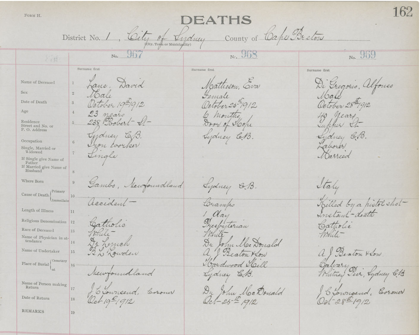 Death Registration: Year: 1912 book: 22 page: 162 number: 969