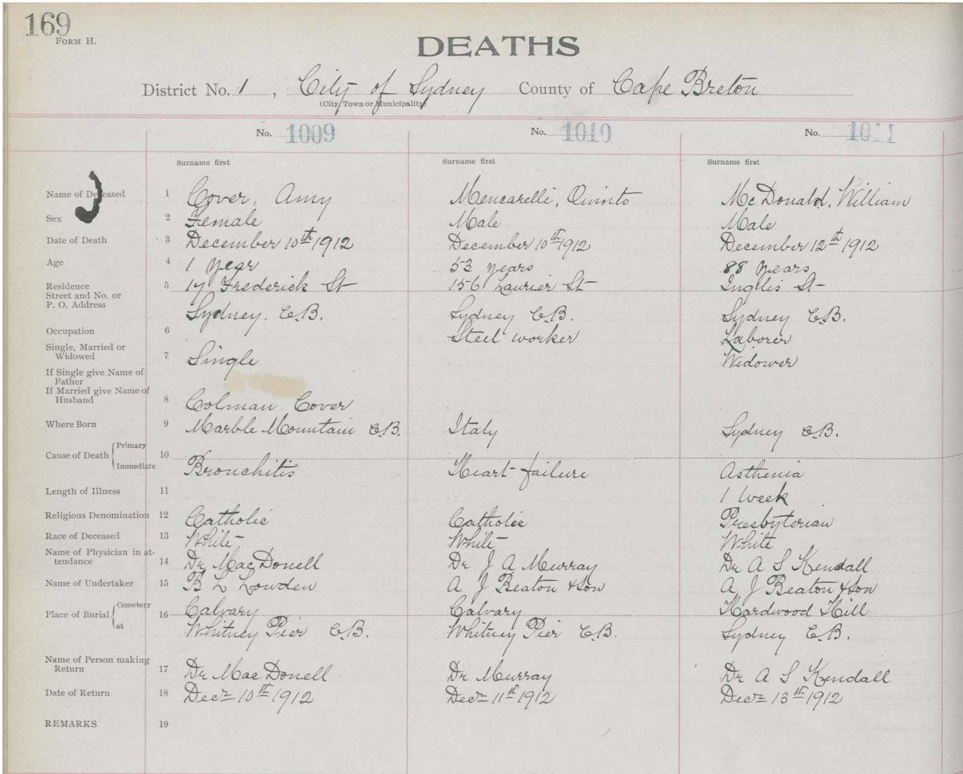 Death Registration: Year: 1912 book: 22 page: 169 number: 1009