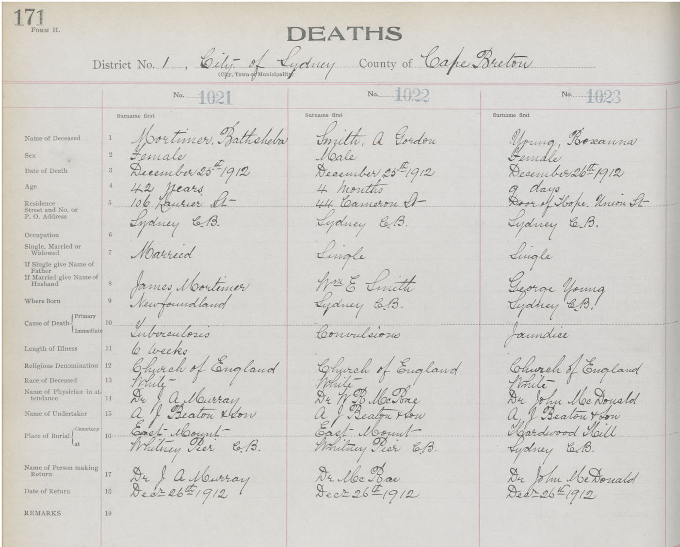 Death Registration: Year: 1912 book: 22 page: 171 number: 1021