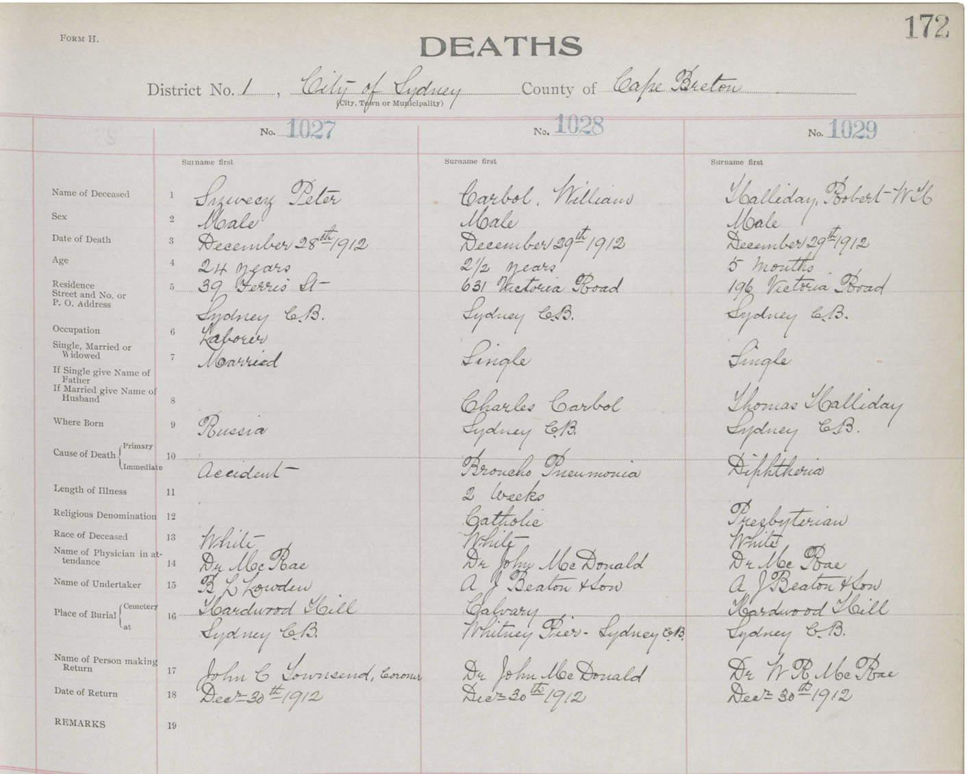 Death Registration: Year: 1912 book: 22 page: 172 number: 1027