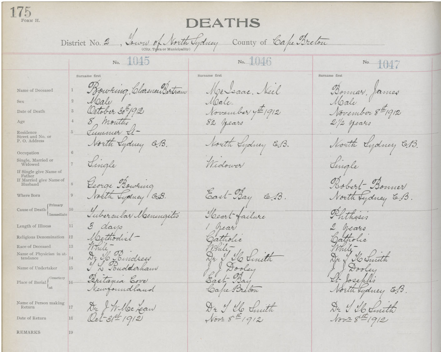 Death Registration: Year: 1912 book: 22 page: 175 number: 1045