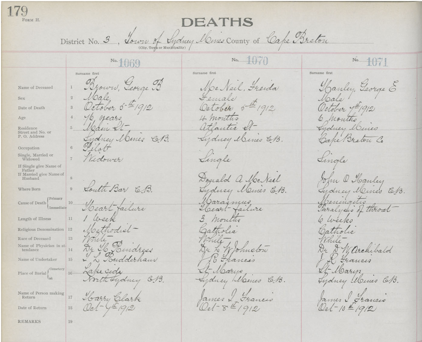 Death Registration: Year: 1912 book: 22 page: 179 number: 1069