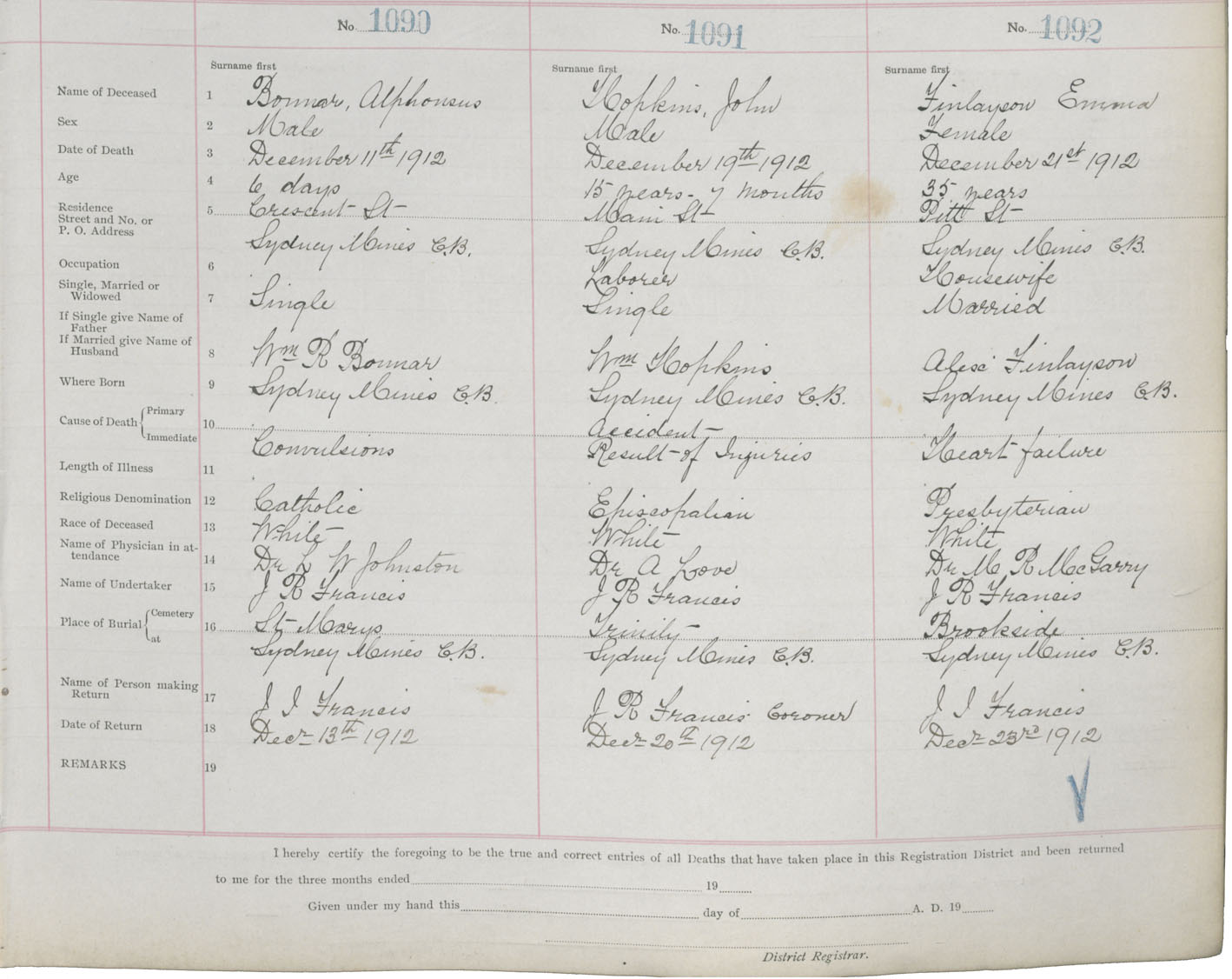 Death Registration: Year: 1912 book: 22 page: 182 number: 1090