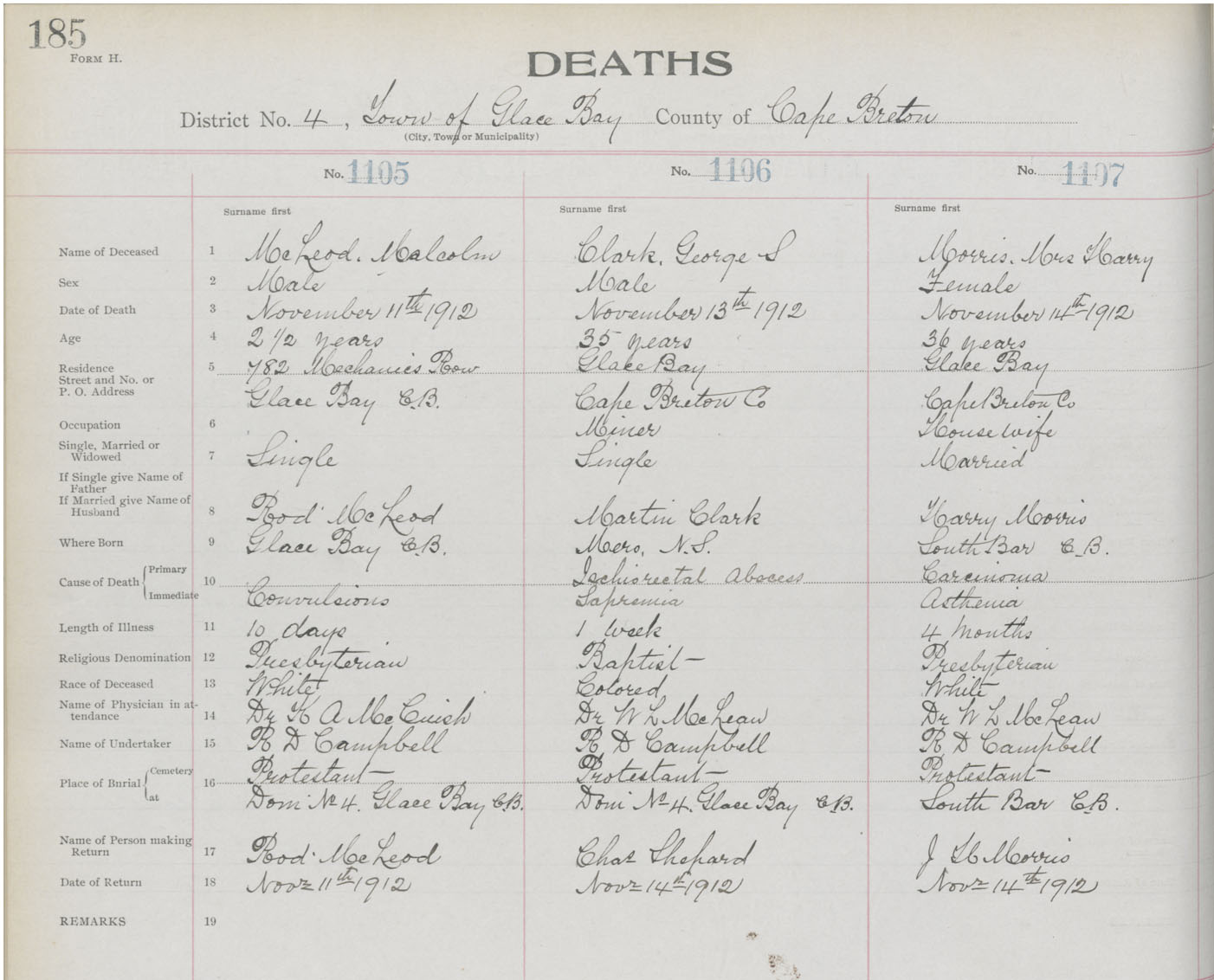 Death Registration: Year: 1912 book: 22 page: 185 number: 1105