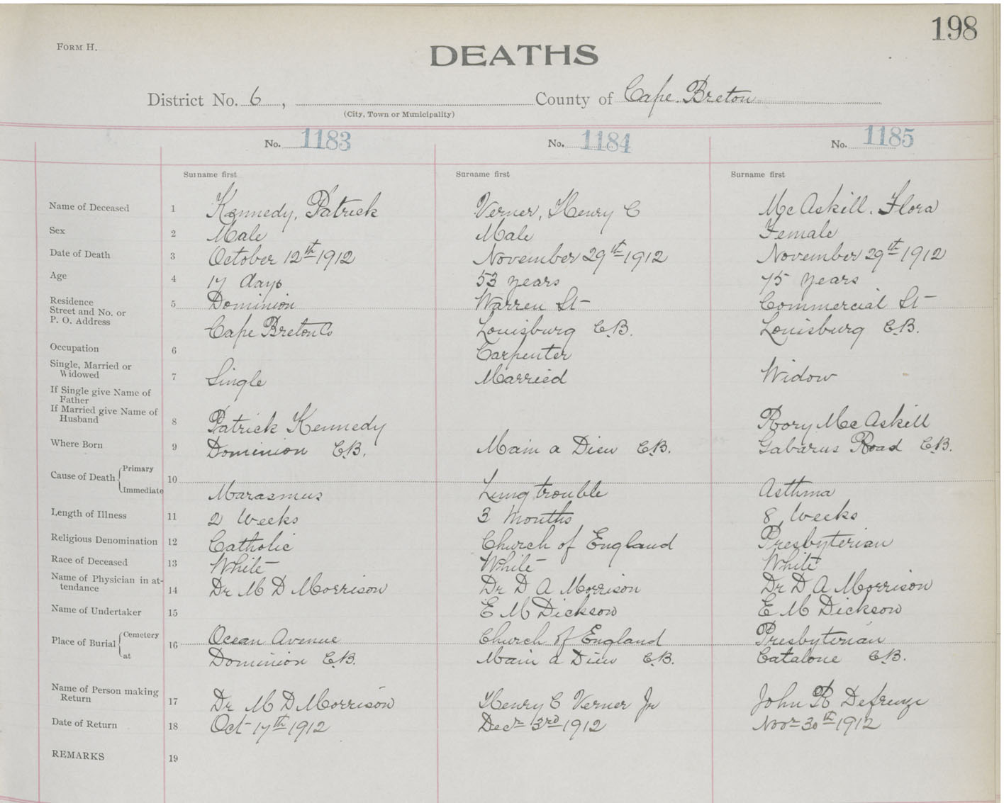 Death Registration: Year: 1912 book: 22 page: 198 number: 1185
