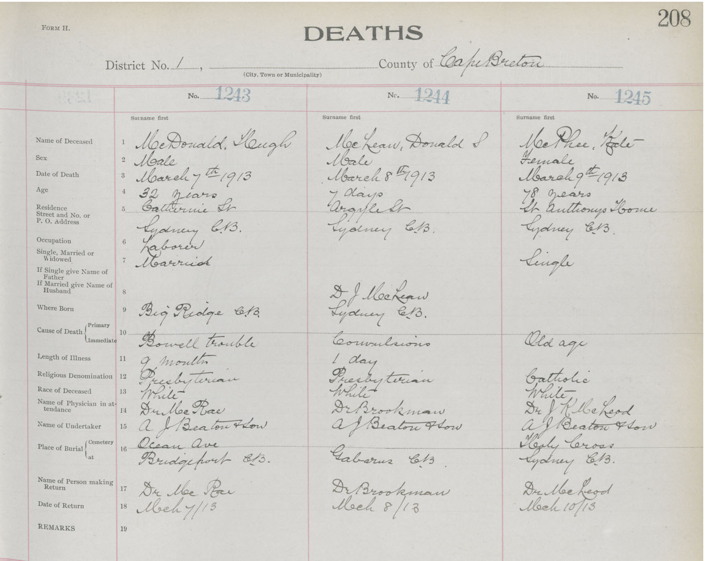 Death Registration: Year: 1913 book: 22 page: 208 number: 1245