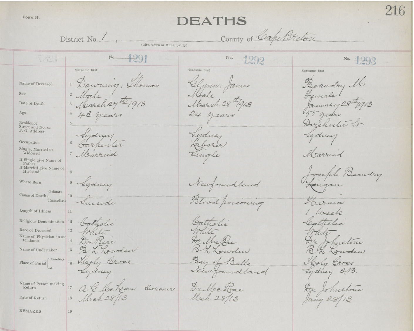 Death Registration: Year: 1913 book: 22 page: 216 number: 1291