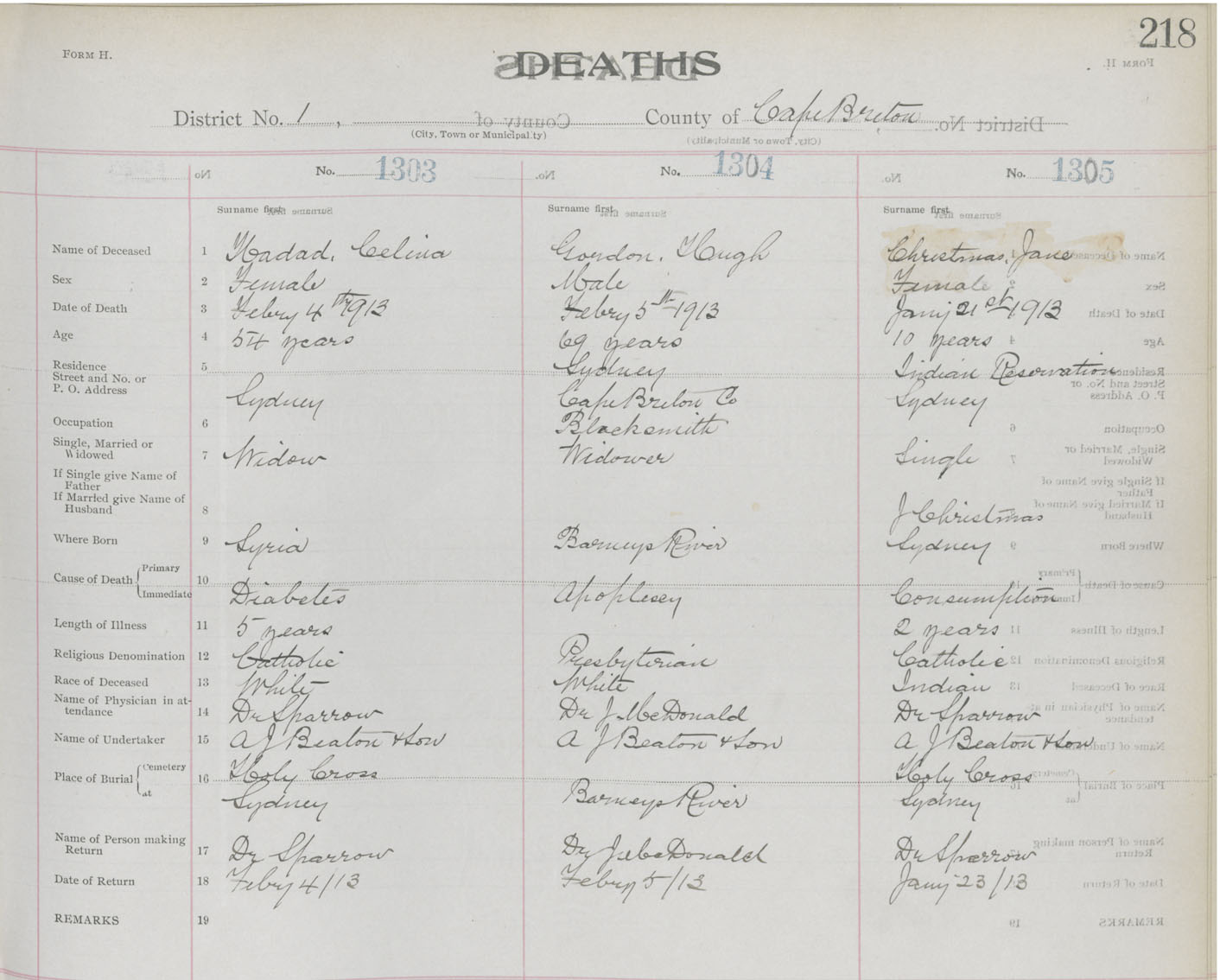 Death Registration: Year: 1913 book: 22 page: 218 number: 1303