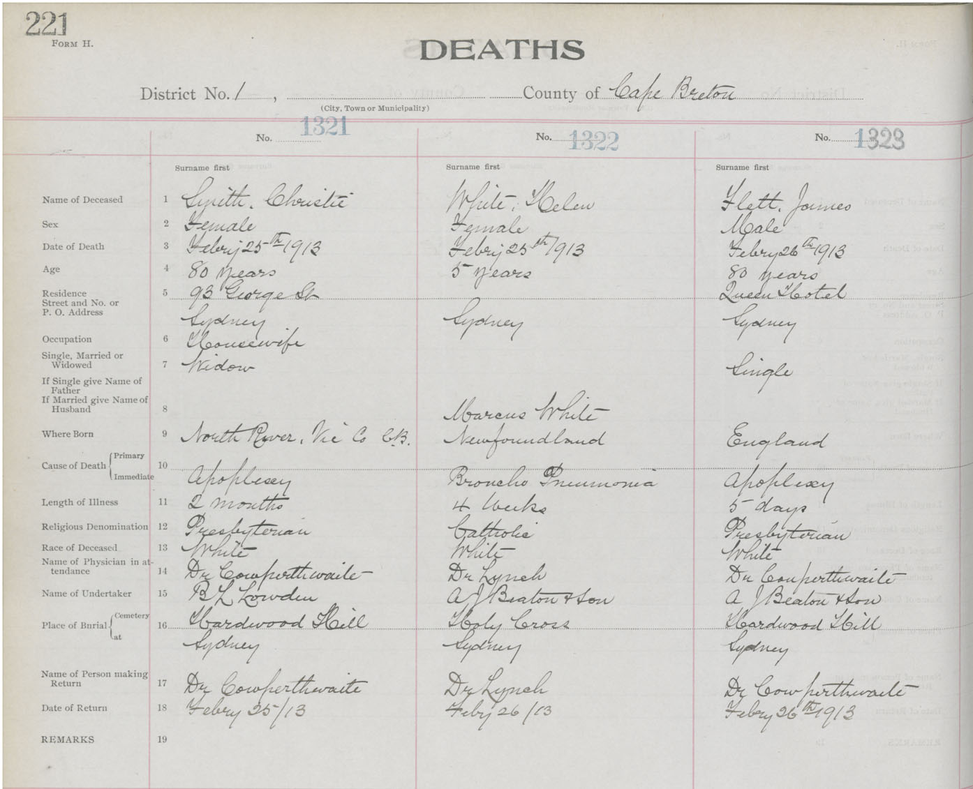 Death Registration: Year: 1913 book: 22 page: 221 number: 1321
