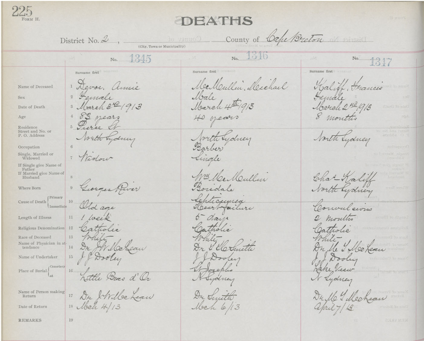 Female Death Registration: Year: 1913 book: 22 page: 225 number: 1347