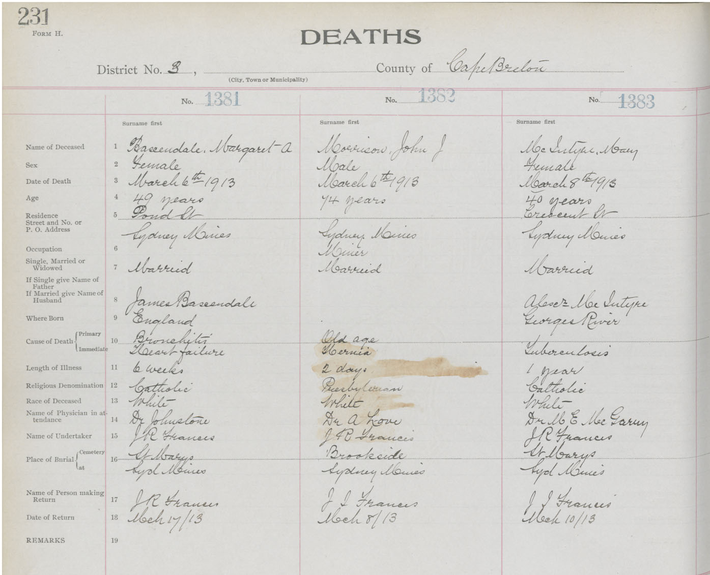Death Registration: Year: 1913 book: 22 page: 231 number: 1381