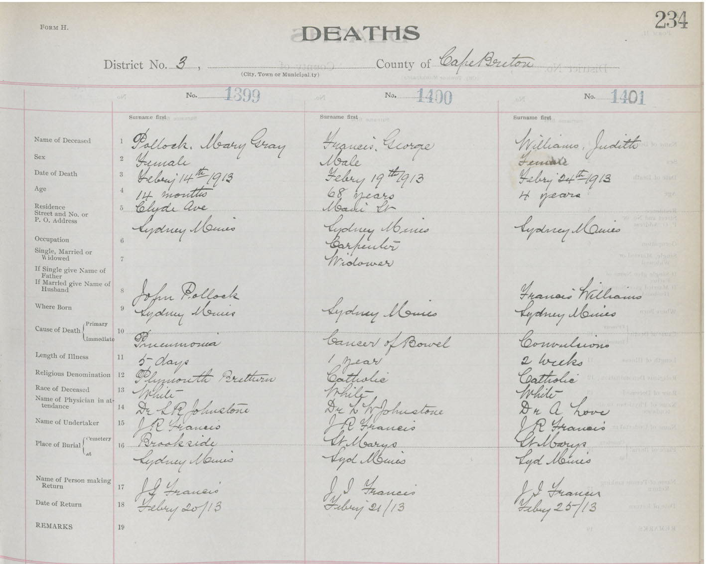 Death Registration: Year: 1913 book: 22 page: 234 number: 1399