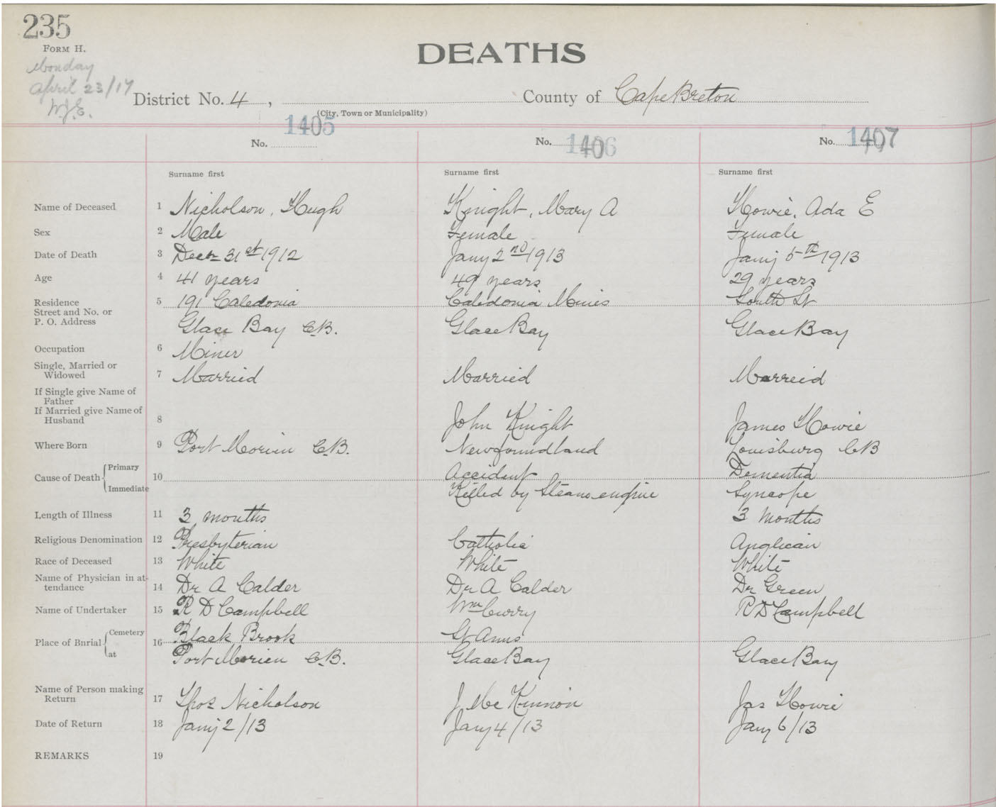 Death Registration: Year: 1913 book: 22 page: 235 number: 1405