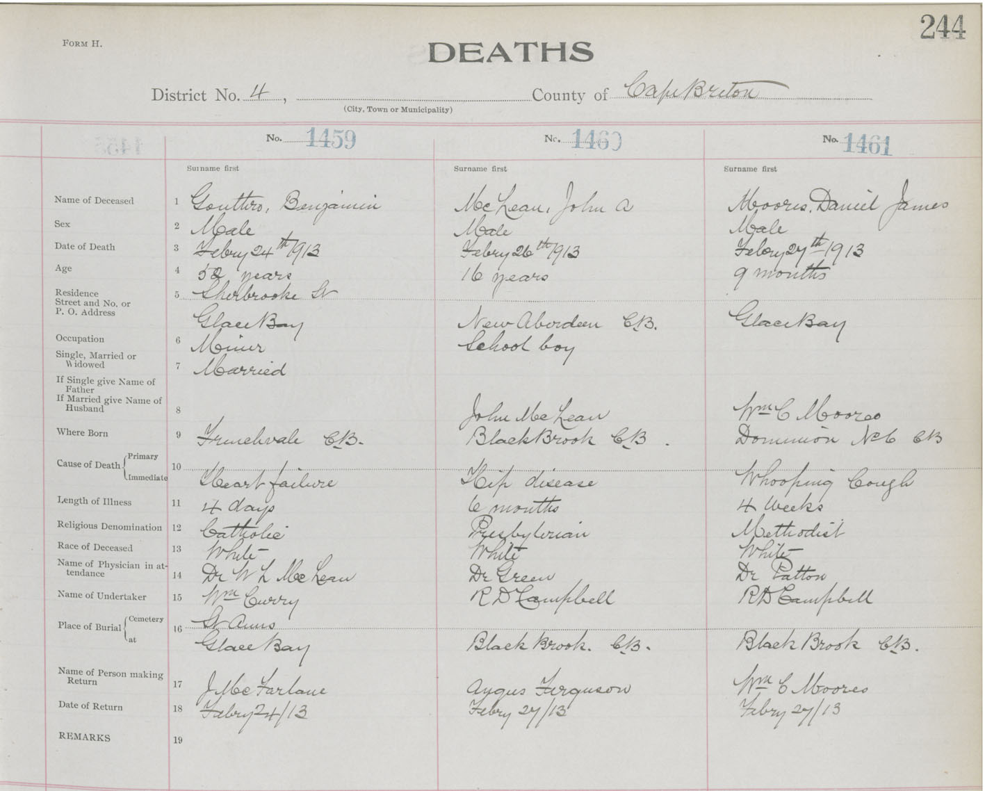 Death Registration: Year: 1913 book: 22 page: 244 number: 1461